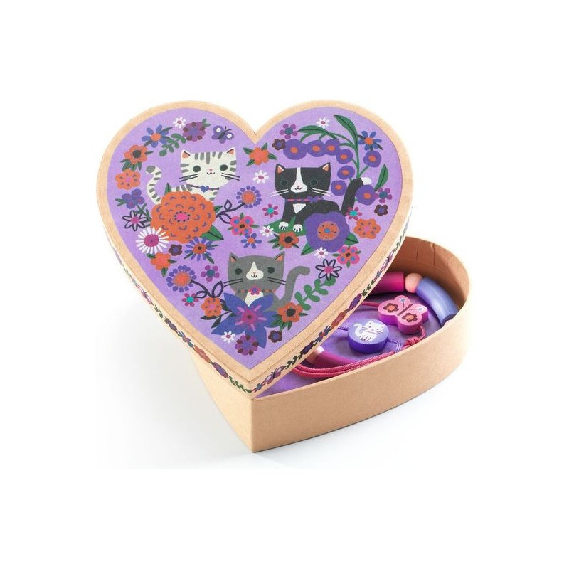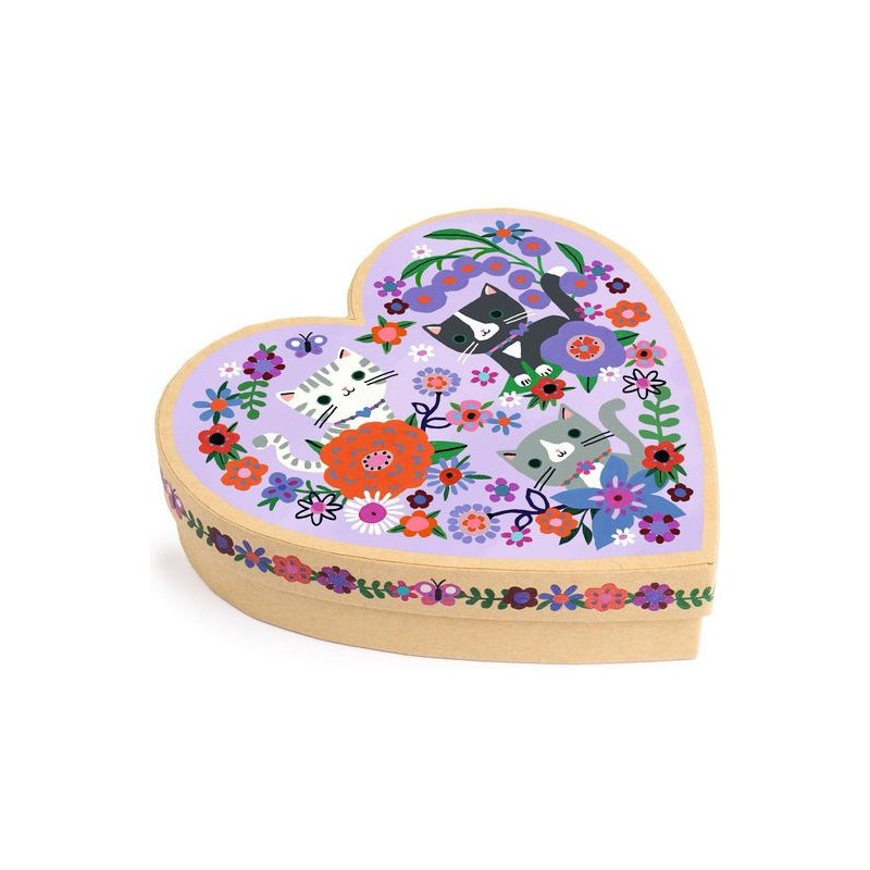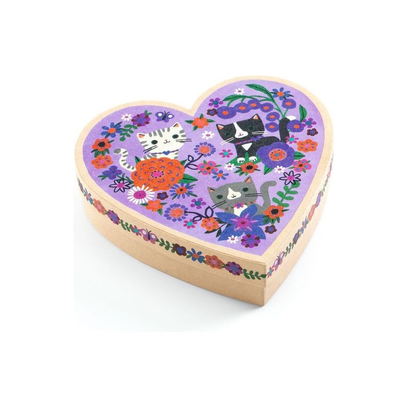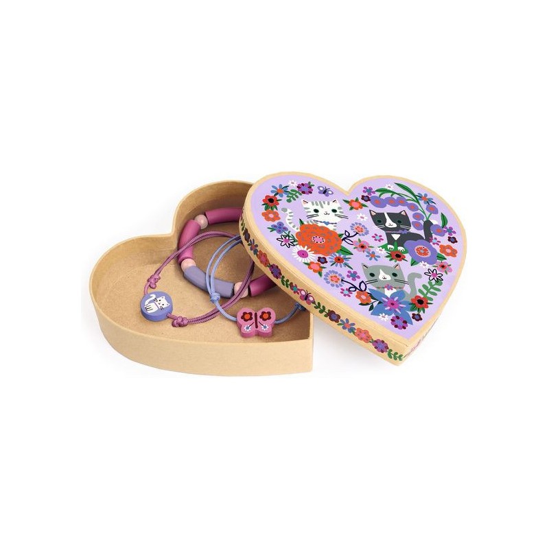 Cette jolie boîte en forme de cœur décorée de petits chats tout mignons cache 3 adorables bracelets.