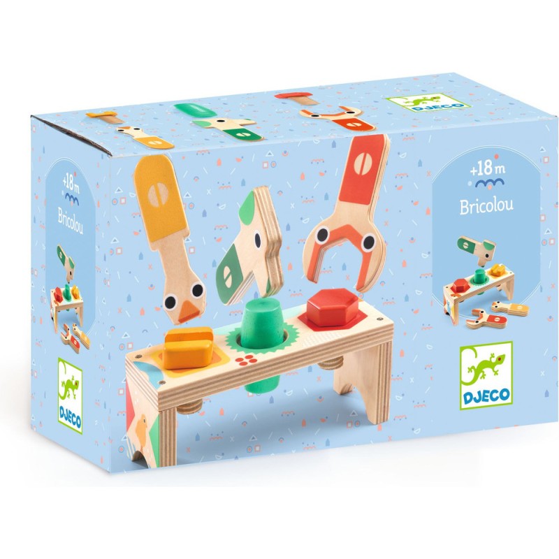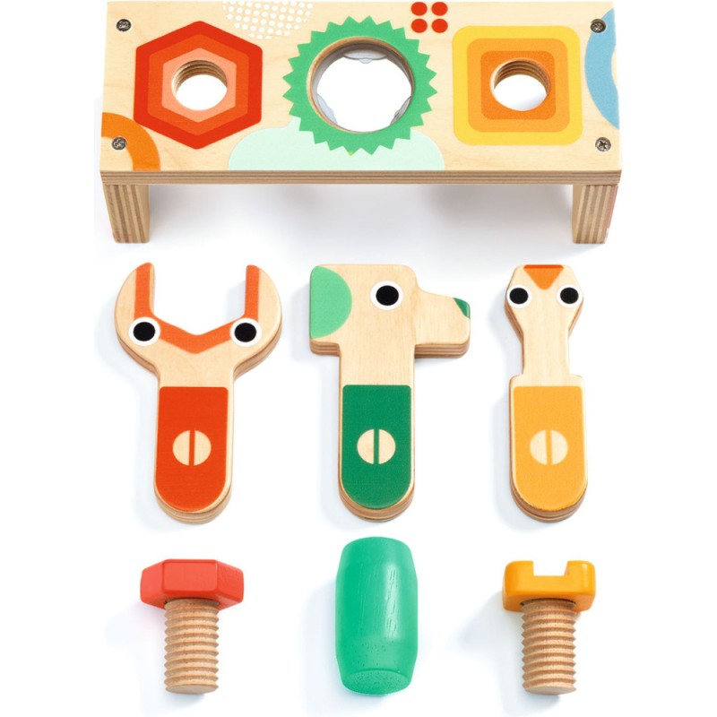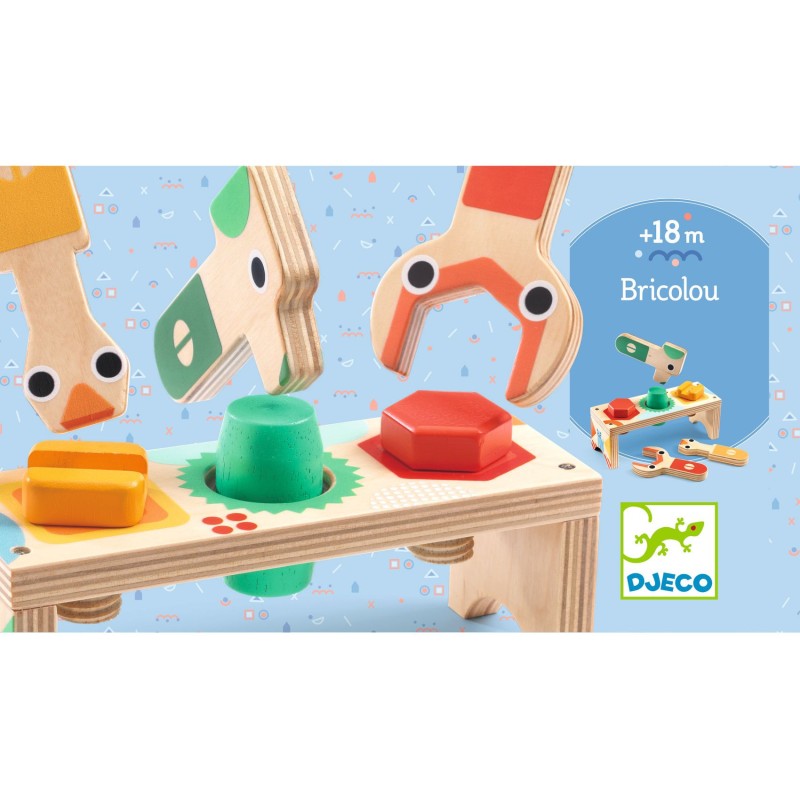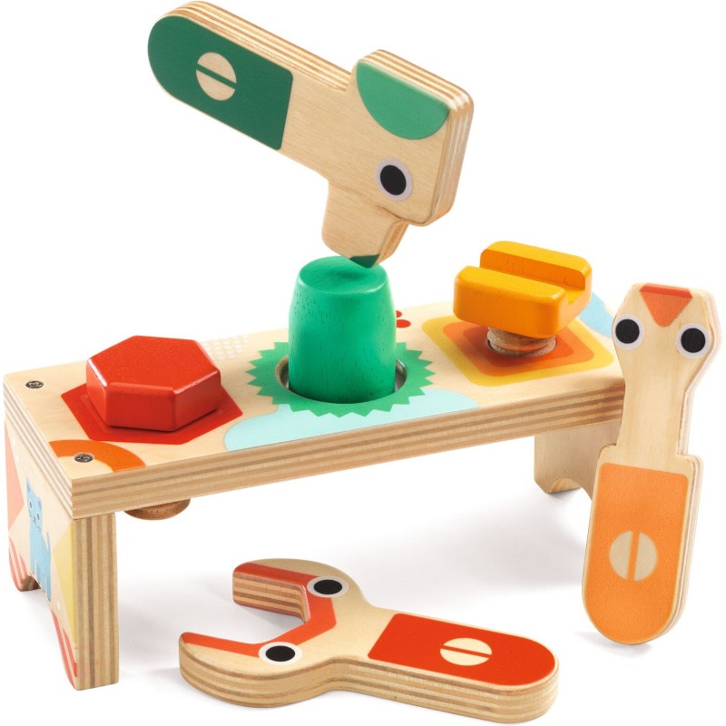Un mini-établi en bois destiné aux petits bricoleurs, dès 18 mois. En se repérant grâce aux couleurs et aux formes, l’enfant cherche sur l’établi l’emplacement qui correspond à chaque élément : un clou vert, une vis jaune et un écrou rouge. Il choisit ensuite le bon outil pour fixer les éléments : clé anglaise, marteau et tournevis.