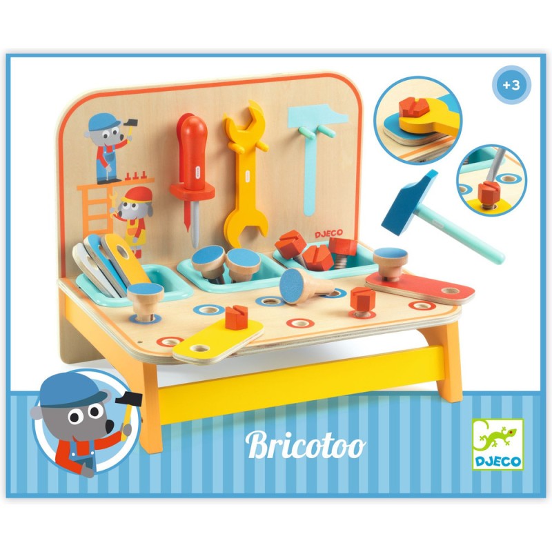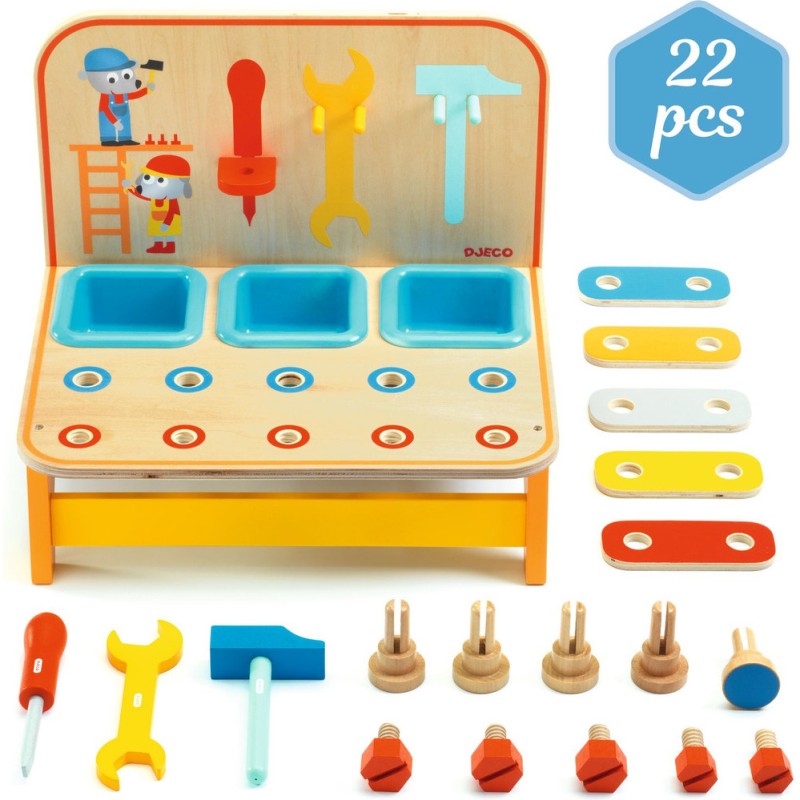 Un établi compact avec tous les accessoires indispensables au petit bricoleur. Chaque outil est parfaitement dimensionné pour s'adapter aux petites mains, facilitant ainsi leur manipulation. Les 3 petits bacs permettent de trier, ranger les petits accessoires. L'ensemble complet du mini-établi est composé de 18 pièces.