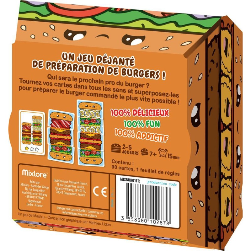 Dans ce jeu de coordination et de rapidité, prenez votre set de cartes d’ingrédients à double-face et commencez à faire des hamburgers ! Retournez les cartes le plus vite possible et dans le bon ordre pour recréer les recettes de la carte objectif et gagner des points en fonction de leur niveau de difficulté. Testez votre vitesse, votre mémoire et votre logique !