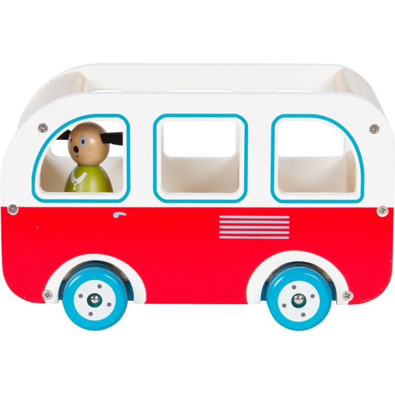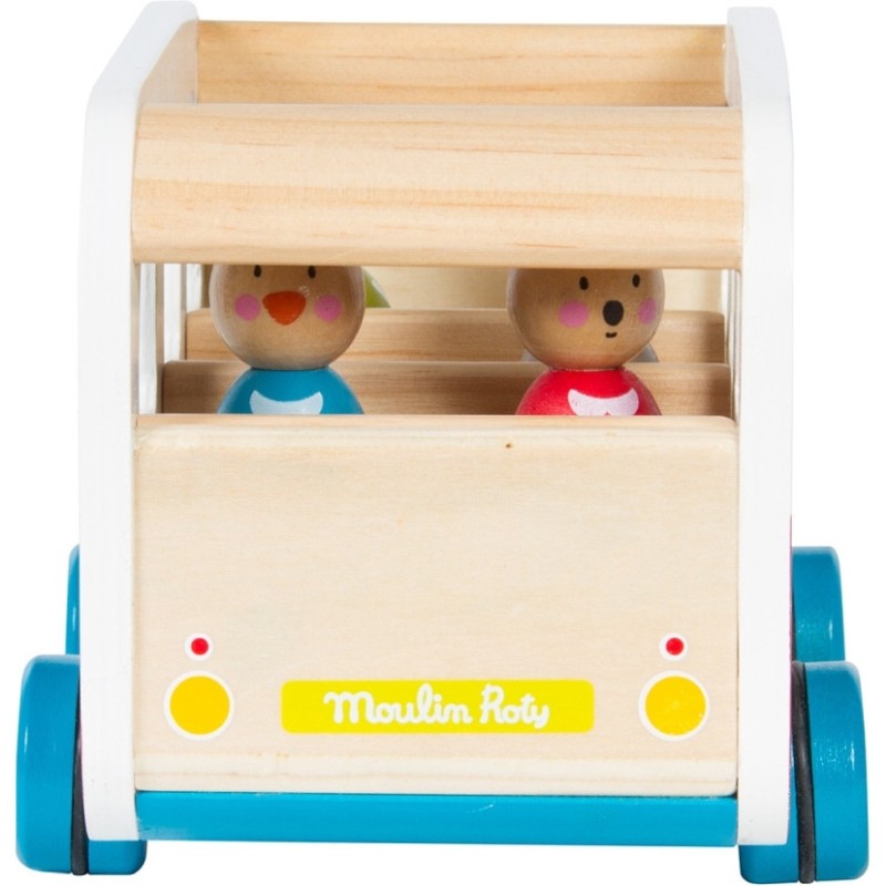 En route pour l'aventure ! Pour promener et transporter 6 personnages de la Grande Famille : bus rétro aux formes rondes, en bois peint, avec comme chauffeur, Julius le chien. Depuis 1997, la collection La grande famille raconte les histoires de Nini la souris, Sylvain le lapin et tous leurs amis au cœur de la forêt.