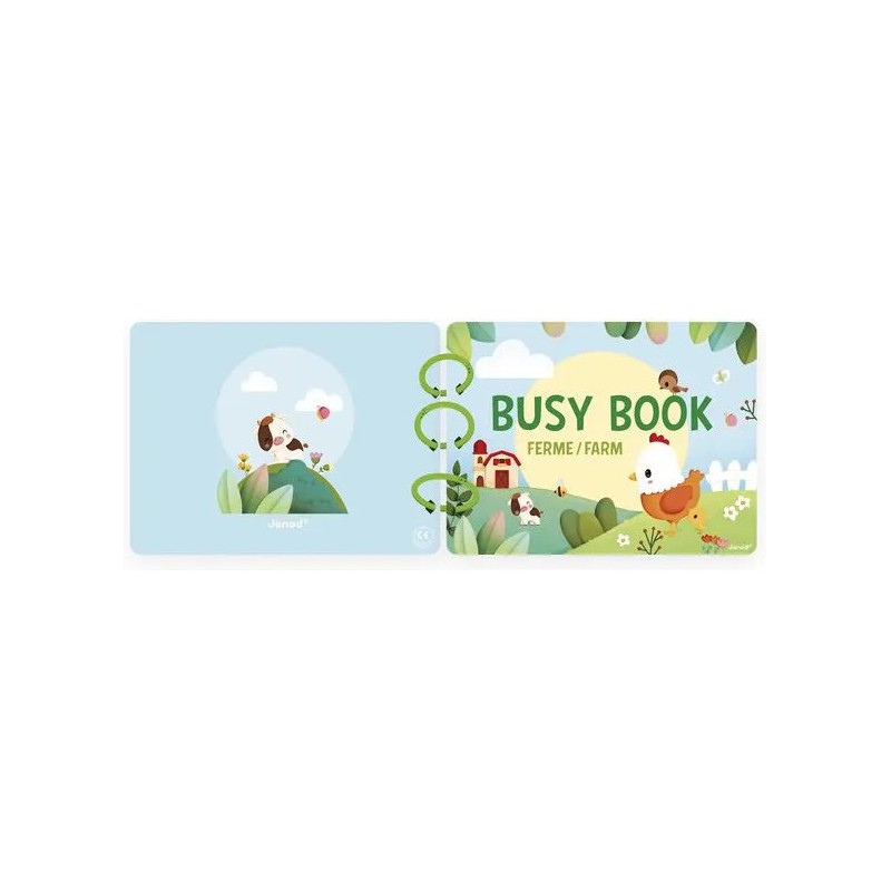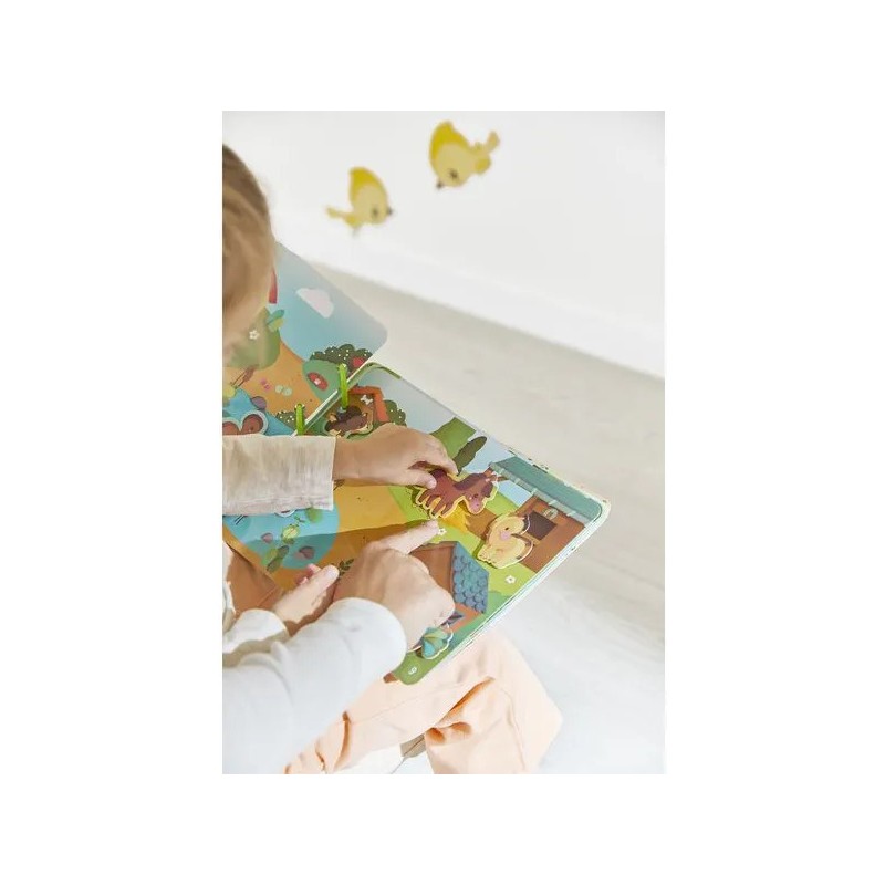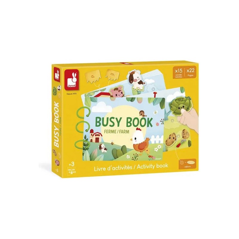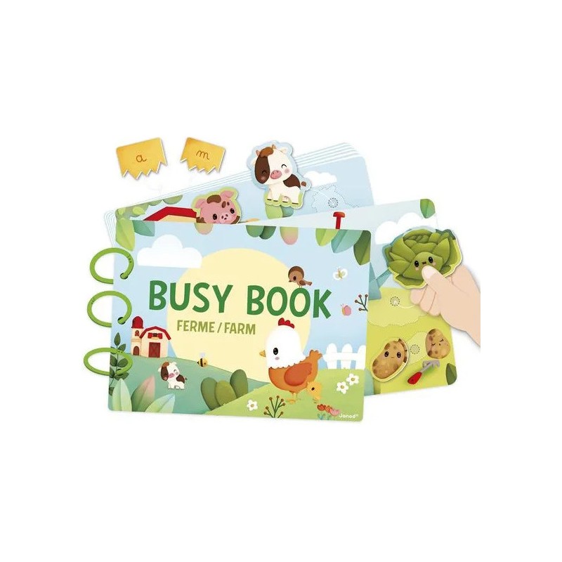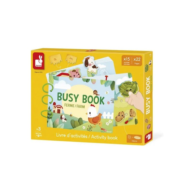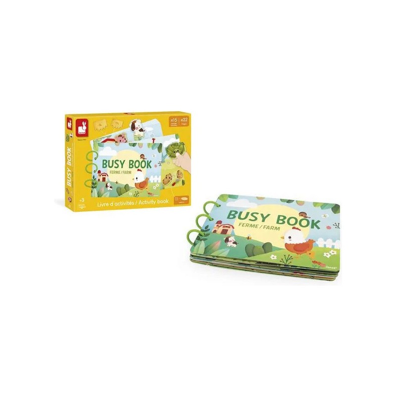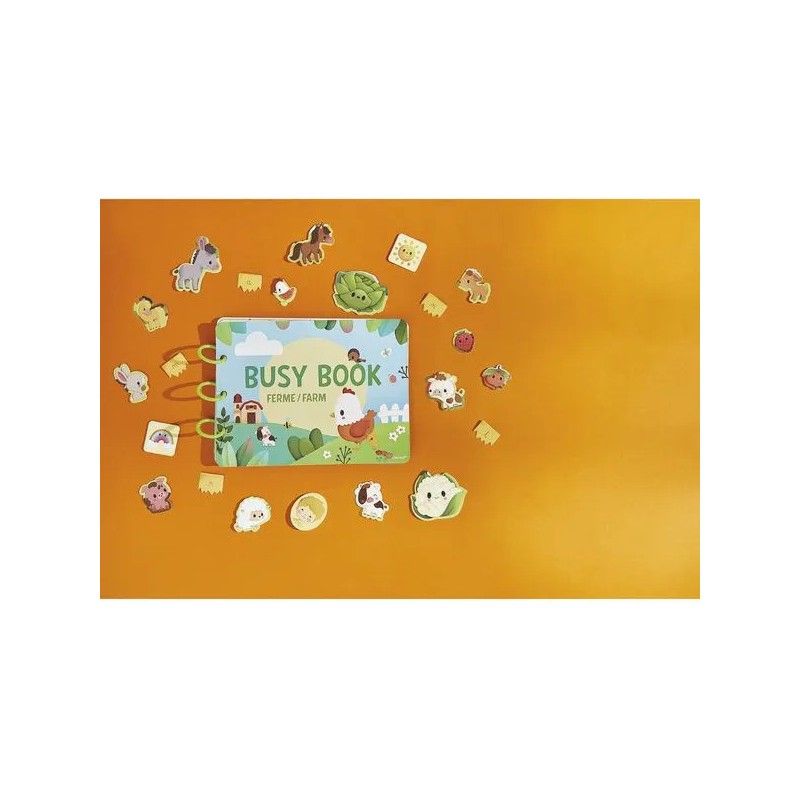Bienvenue à la ferme ! Ce busy-book composé de 20 pages d'activités fait découvrir aux tout-petits dès 3 ans la vie à la ferme. Et il s'en passe des choses là-bas ! Les animaux gambadent dans les prés, les poussins sortent de leur coquille, les légumes grandissent sous le soleil… Les enfants ont mille choses à découvrir ! Ils y retrouvent les animaux stars de la ferme : la poule, la vache, le cochon, le lapin... Et même le dindon ! Au fil des pages, les enfants se familiarisent avec leurs habitats et observent les scènes de la vie quotidienne. Chaque activité invite à manipuler, observer et nommer pour apprendre en s’amusant. Au total, 158 pièces sont à placer dans le livre ! Les illustrations douces et vivantes ont été pensées pour éveiller la curiosité, enrichir le vocabulaire et développer la motricité fine. Et ce n’est pas tout : les plus grands pourront aussi s’initier aux chiffres et à l’alphabet, en majuscules et minuscules. Un vrai coup de pouce pour développer le langage et les premières notions scolaires. Pratique et évolutif, ce livre d'activités est relié par 3 anneaux en plastique détachables, permettant aux parents de sélectionner les pages les plus adaptées à l’âge et au rythme de l’enfant. Une belle façon de faire grandir le livre avec lui ! Ce jeu d’éveil est parfait pour des moments de jeu autonomes. Grâce à son format livre, il s'emporte facilement partout ! Dimensions : 27 x 21 cm. Ce busy-book est composé de carton Fsc™. Place à la découverte !