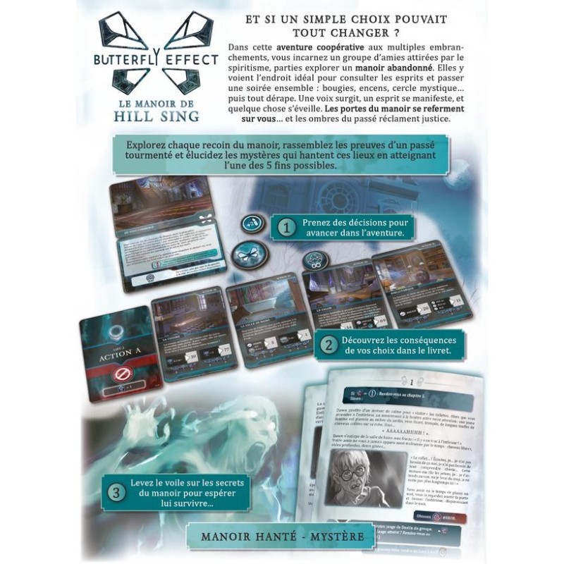 Découvrez la deuxième aventure de la gamme Butterfly Effect avec ce nouveau volet intitulé Le Manoir de Hill Sing ! Butterfly Effect est un jeu narratif et coopératif dont la mécanique principale repose sur le choix. Tout au long de votre aventure, vous traverserez différentes Ères (temporelles ou géographiques). Chacune d’elles vous proposera diverses Actions à accomplir : à vous d’utiliser vos jetons Action pour les réaliser et façonner votre personnage. Chaque scénario introduit ses propres mécaniques, renouvelant ainsi l’expérience Butterfly Effect. Dans Le Manoir de Hill Sing, vous incarnez un groupe d’amies attirées par le spiritisme, parties explorer un manoir abandonné… Hanté, il vous piège entre ses murs ! Pour espérer vous en sortir vivantes, explorez chaque recoin, rassemblez les preuves d’un passé tourmenté et élucidez les mystères qui hantent ces lieux en atteignant l’une des 5 fins possibles. Parviendrez-vous à lui survivre ? À vous de jouer, maintenant. Mais n’oubliez pas… Et si un simple choix pouvait tout changer ?