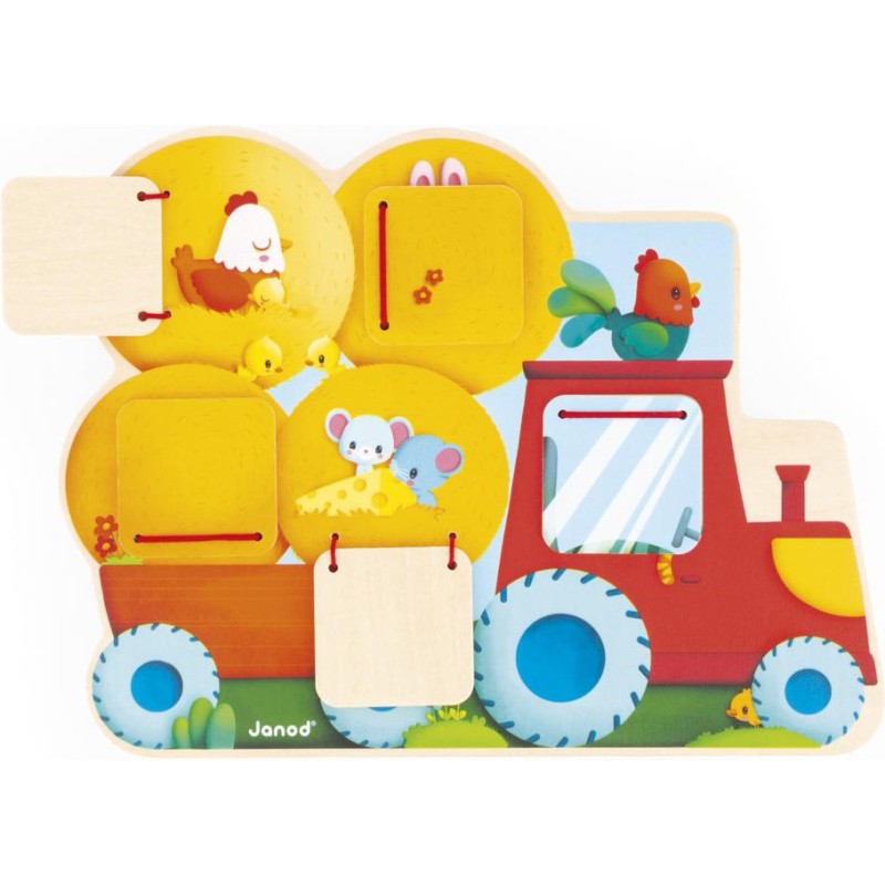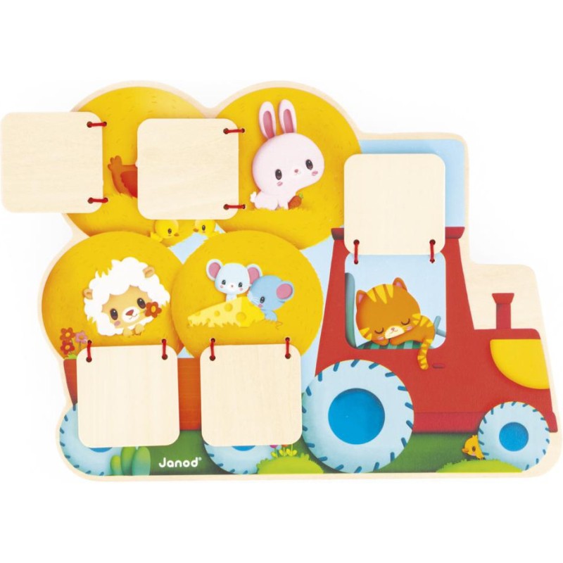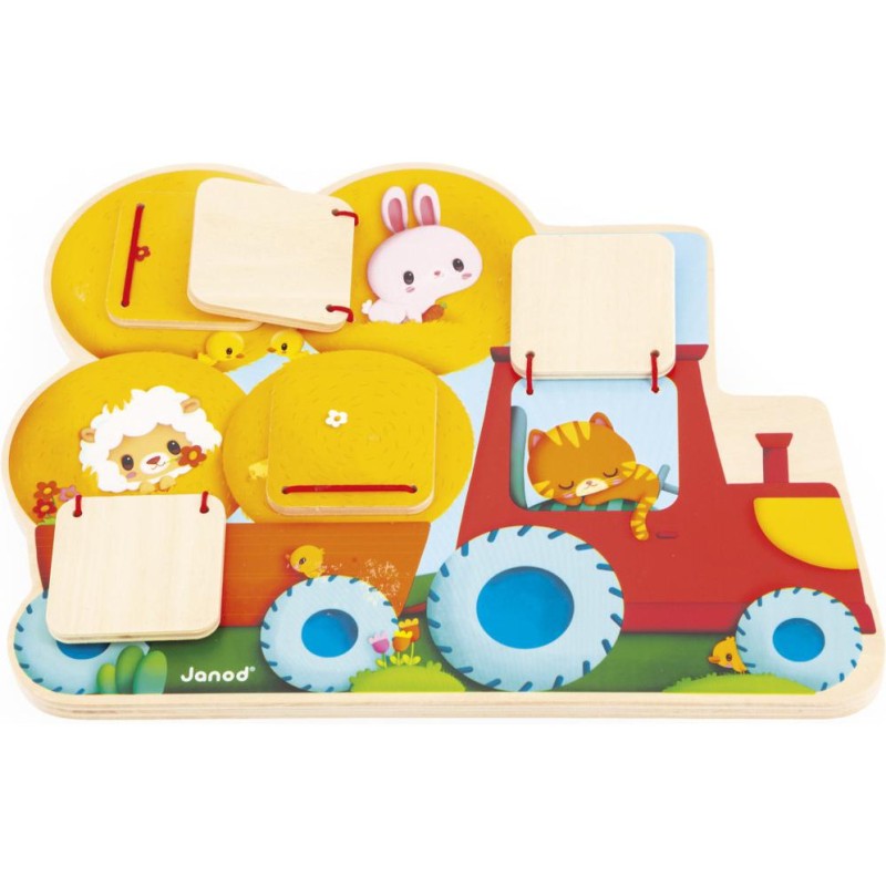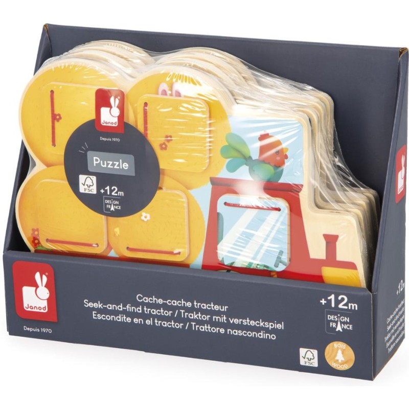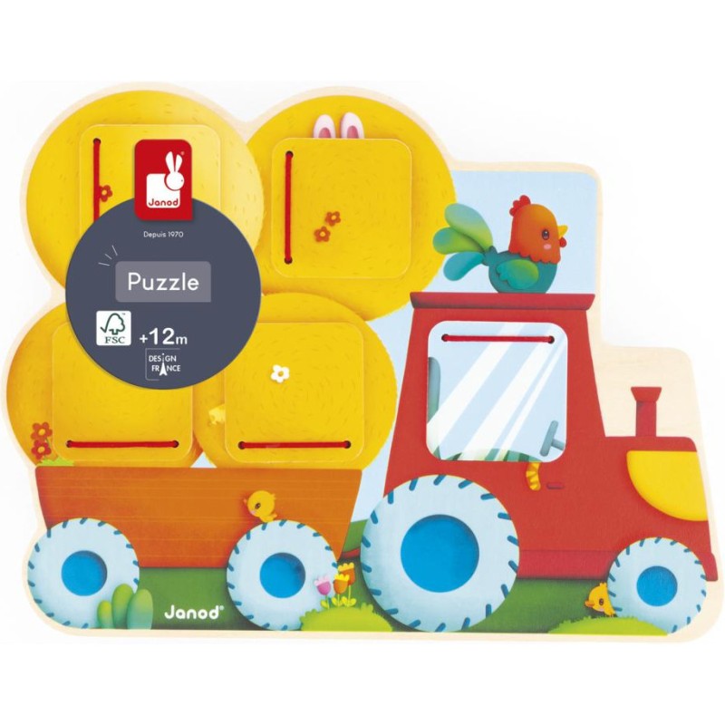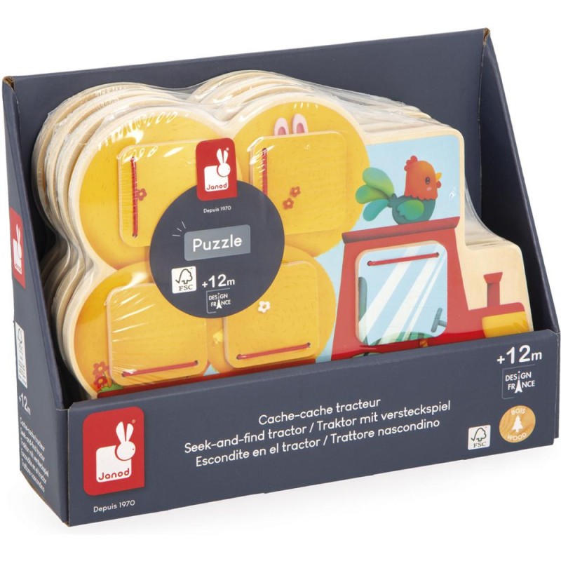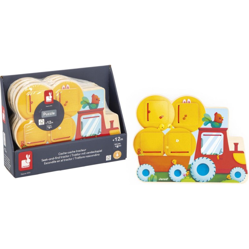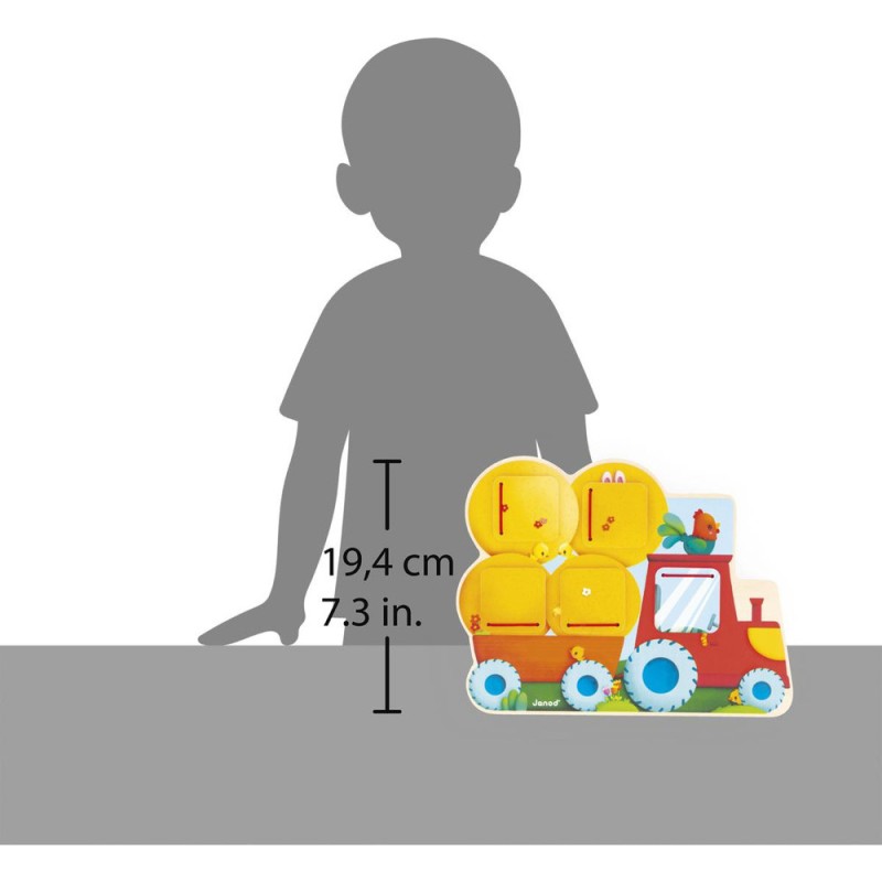 Qui se cache dans le tracteur ? Et dans la remorque ? Bébé va vite le découvrir en ouvrant les volets de ce cache-cache tracteur en bois ! Adapté dès 12 mois, ce support se présente comme un puzzle. Sa particularité, c’est de proposer 5 fenêtres à ouvrir pour découvrir les animaux les plus chou de la ferme ! Facile à manipuler par les tout-petits, les volets se referment seuls grâce à des élastiques. En les ouvrant, bébé découvre un lapin, un mouton, un chaton endormi, et bien d’autres ! Un jouet d’éveil parfait pour développer son sens de l’observation et sa motricité fine. D’ailleurs, un petit indice s’est glissé à côté de chaque fenêtre pour aider bébé à deviner qui s’y cache ! Ce jeu de manipulation invite les petits dans l’univers de la ferme, rythmé par la nature et riche en découvertes. Par un bel après-midi, les animaux s’empressent de s’installer sur le siège du tracteur ou dans les bottes de paille pour faire la sieste ! Avec ce jouet premier âge en bois, vous êtes assuré(e) d’occuper bébé pendant de longs moments avec un jeu durable et ludique. Ce cache-cache tracteur est composé de bois issu de forêts gérées durablement, certifié Fsc™. Format 25 x 19 cm.