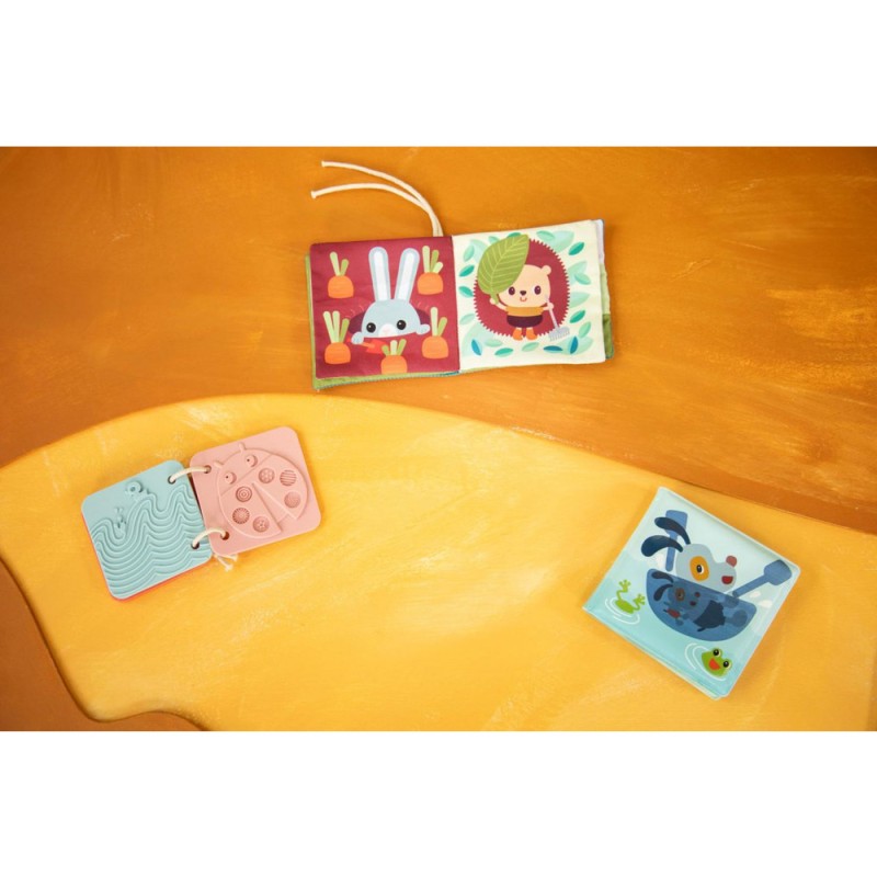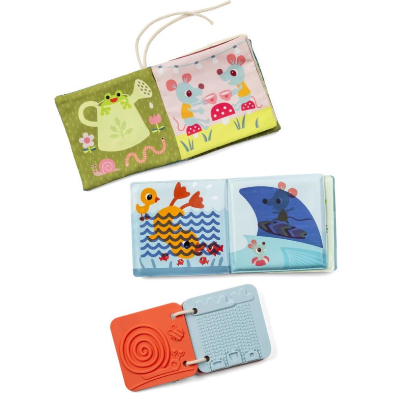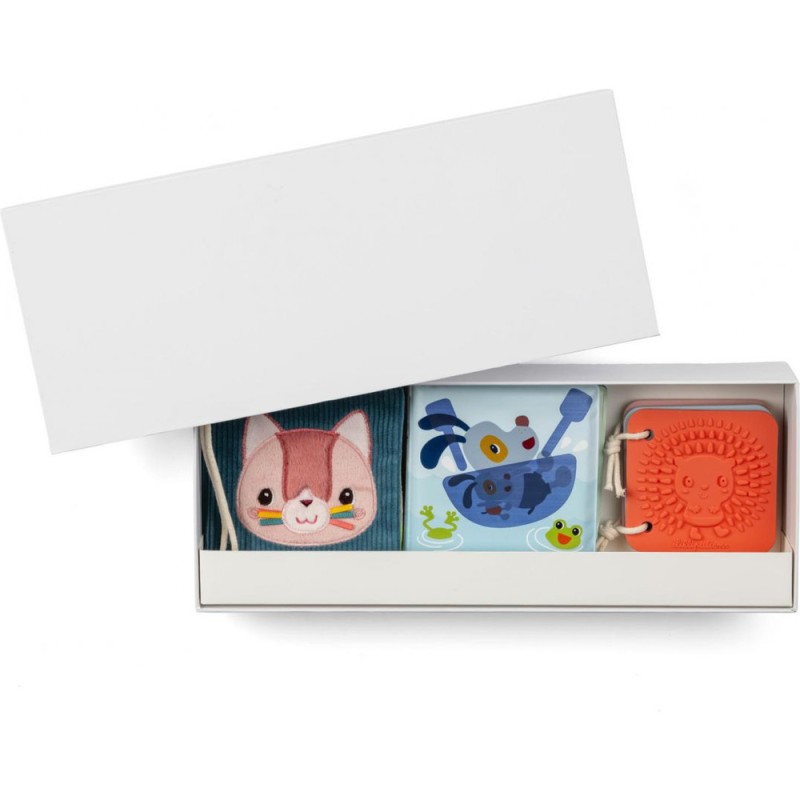 Pour cela, retrouvez : un livre en tissu avec de nombreuses textures et illustrations à découvrir, un imagier en silicone à parcourir du bout des doigts, et un livre de bain magique dans lequel les illustrations apparaissent au contact de l’eau. Ce trio stimulant et coloré se pare d’illustrations originales, mettant en scène Jeanne le chat, Jules le chien, et bien d’autres nouveaux amis !