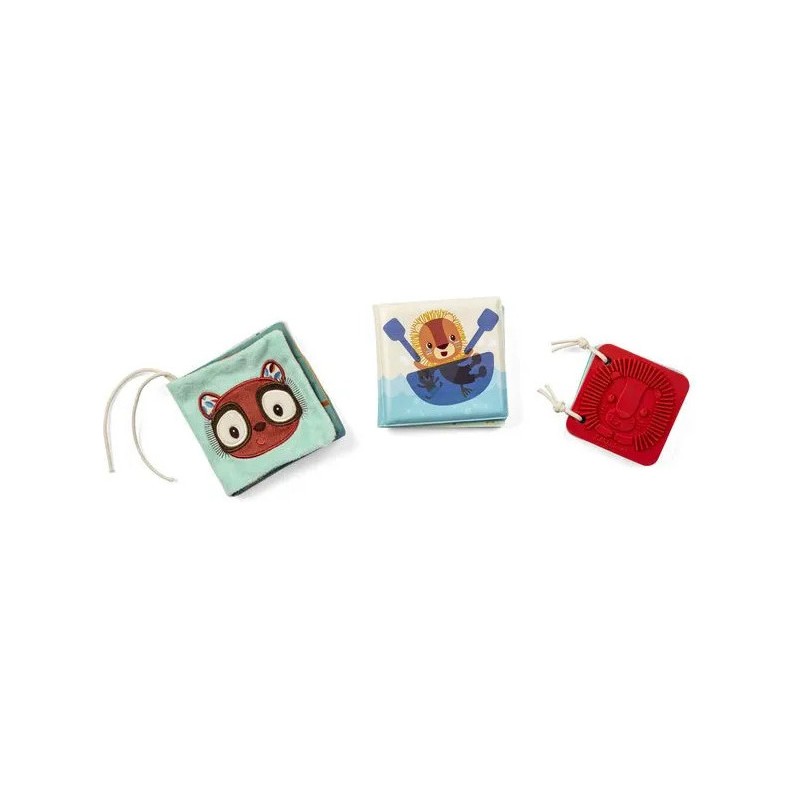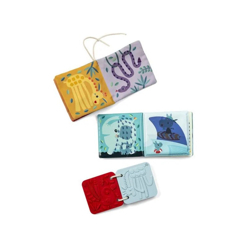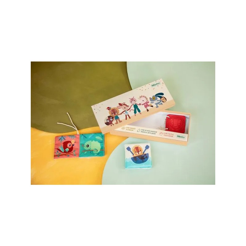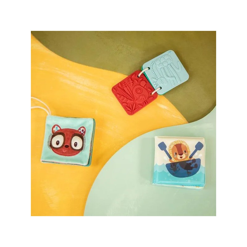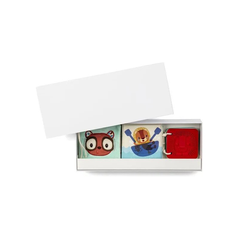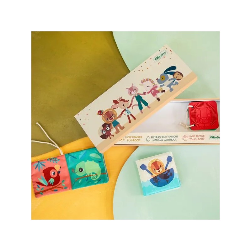 Voici les premiers livres sensoriels de bébé ! Ce set de 3 livres d’éveil en différentes matières convient dès la naissance : un cadeau idéal, qui saura éveiller les sens et attiser la curiosité des petits. Présentés dans leur joli coffret illustré, ces jouets d’éveil sensoriel proposent 3 histoires sur le thème de la jungle. Pour cela, retrouvez : un livre en tissu avec de nombreuses textures et illustrations à découvrir, un imagier en silicone à parcourir du bout des doigts, et un livre de bain magique dans lequel les illustrations apparaissent au contact de l’eau. Ce trio stimulant et coloré se pare d’illustrations originales, mettant en scène Jack le lion, Elvis le lémurien, et bien d’autres nouveaux amis ! Ce sont les premiers compagnons de bébé, pour des premières histoires à partager ensemble ! Avec ces livres d’éveil, il apprend à être curieux et s’éveille au monde à son rythme. A l’heure du bain, comme au moment de se coucher, ou encore pendant ses temps d’éveil. Leur forme et leur taille ont été pensées pour une prise en main facile par les plus petits. Voilà une tendre idée cadeau pour un bout de chou, dans une boîte à l’image de notre joyeuse bande Lilliputiens, pour faire fondre toute la famille ! Des petits livres concentrés de découvertes !
