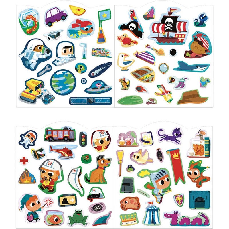 Avec autant de stickers, le plaisir est garanti… et pour longtemps ! Pour ravir les amateurs d’autocollants, ouvrez ce joli cahier qui a pris la forme du casque de pompier et plongez dans l'univers des explorateurs : 7 scènes à compléter avec les 8 planches d’autocollants intégrées. Pirates, astronautes, pompiers, super-héros… chaque scène invite à inventer des histoires pleines d’action et de rebondissements !
