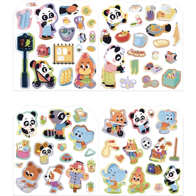 Avec autant de stickers, l’amusement est garanti… et pour longtemps ! Pour combler les petits passionnés d’autocollants, ouvrez ce joli cahier en forme de petit panda et explorez les différentes activités qui composent son quotidien : il contient 7 scènes à décorer à l’aide des 8 pages d’autocollants agrafées.