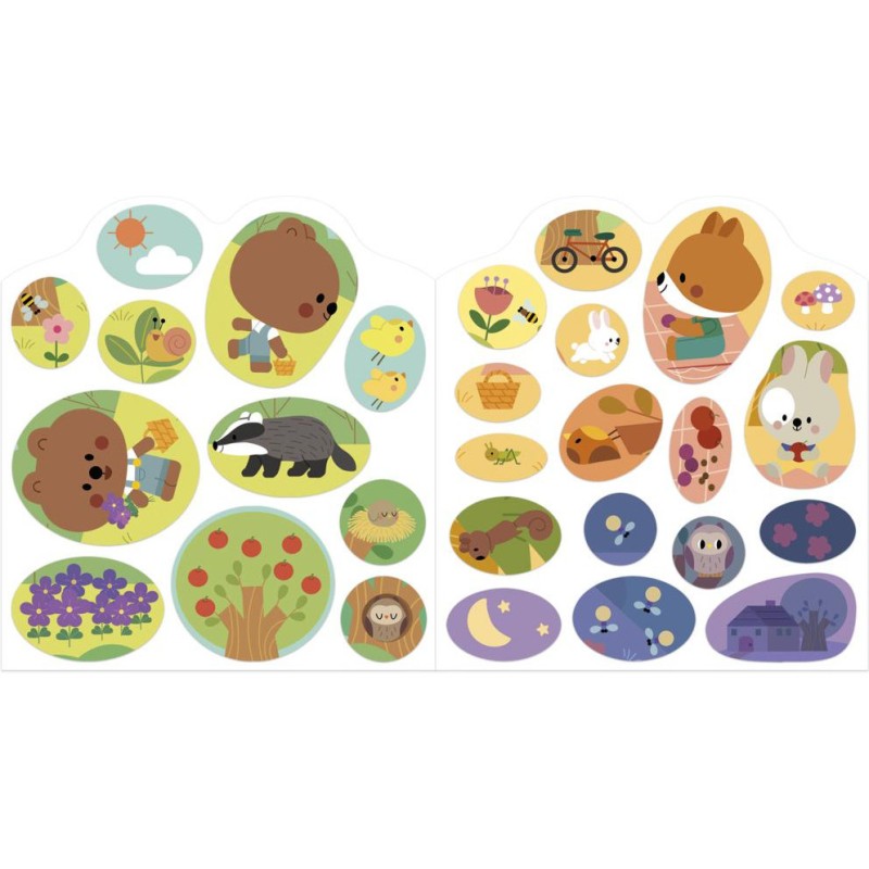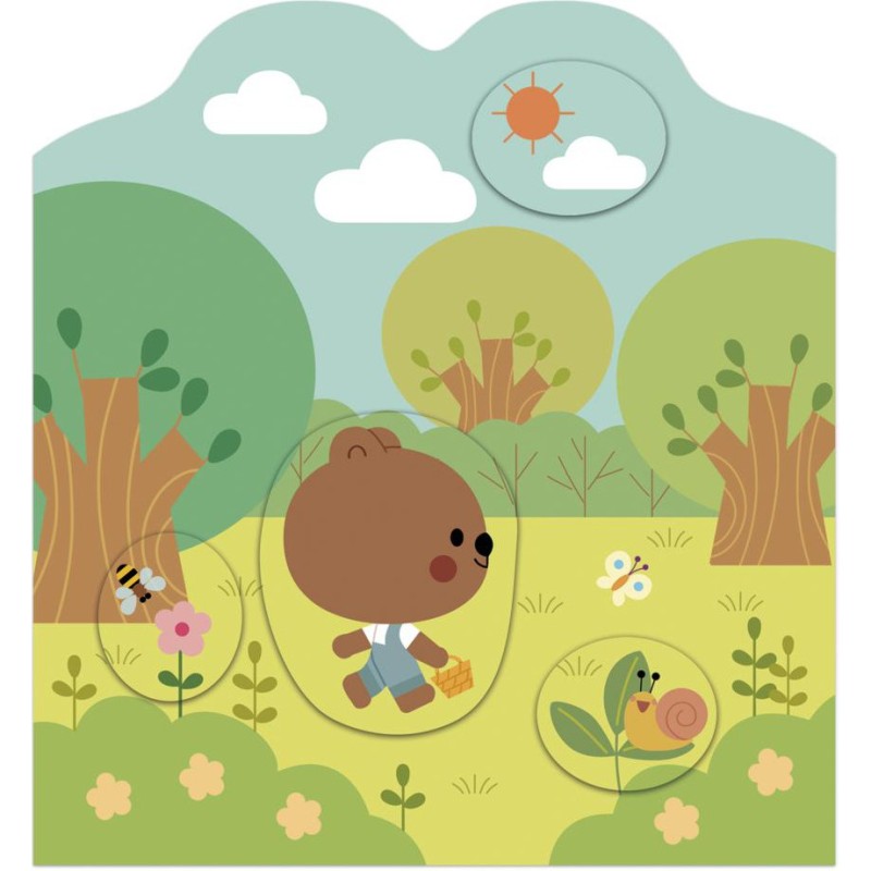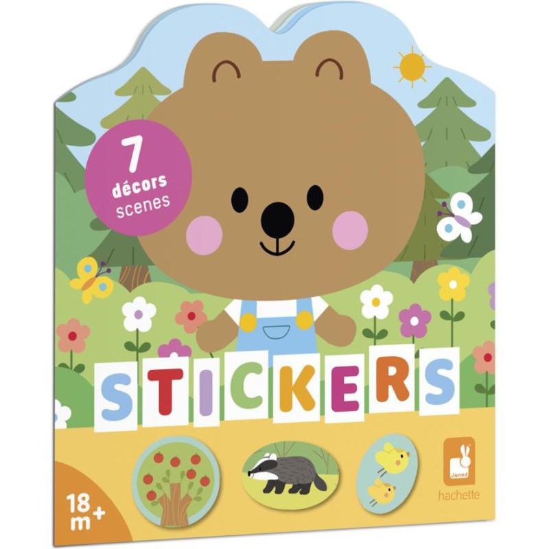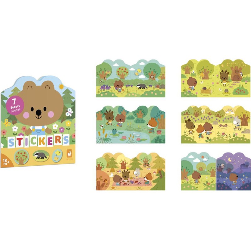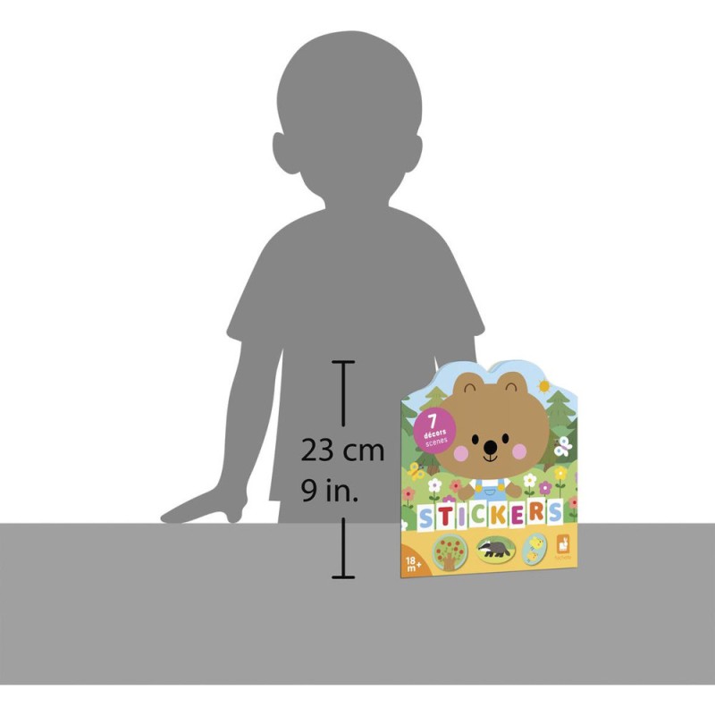 Des stickers pour découvrir la forêt et ses mystères ! Ce cahier d’autocollants et de décors sur le thème de la forêt convient aux bébés et aux enfants dès 18 mois. Pratique à emporter partout, il permet aux petits de développer leur vocabulaire tout en stimulant leur motricité fine. Avec autant de stickers, on ne peut qu’être bien occupé … Et pendant longtemps ! Pour satisfaire les amateurs d’autocollants, ouvrez ce joli cahier en forme de petit ours brun et explorez les sous-bois : le cahier se compose de 12 pages de décors illustrés, pour couvrir des paysages qui changent en fonction des saisons à l’aide des 8 pages d’autocollants agrafées dans le cahier ! La taille des stickers a été spécialement pensée pour s’adapter aux mains des plus petits : ils ont tous une forme simple, sans débord, pour faciliter la prise en main. L’autre atout de ces autocollants pour bébé ? Ils sont repositionnables, pour prolonger le plaisir ! Malin, les emplacements des stickers sont en couleur descendue, pour aider l’enfant à les coller au bon endroit. Ce cahier de stickers est un indispensable pour occuper les longs trajets ou pour apprendre à patienter dans le calme. En manipulant les autocollants, bébé développe sa motricité fine et même sa créativité ! Les jolies couleurs, la grande variété de personnages et d’éléments de la nature, ainsi que les designs super mignons, attiseront sa curiosité ; pour le divertir, de la mare aux sentiers de randonnée !