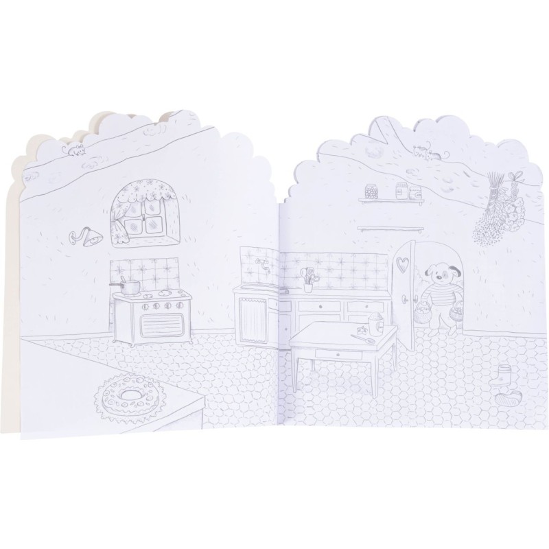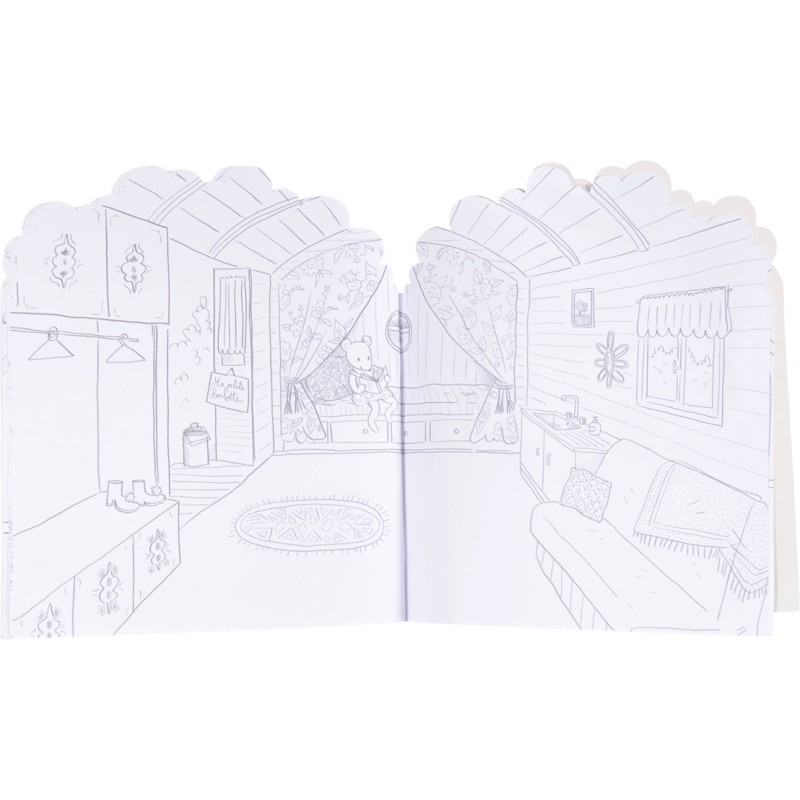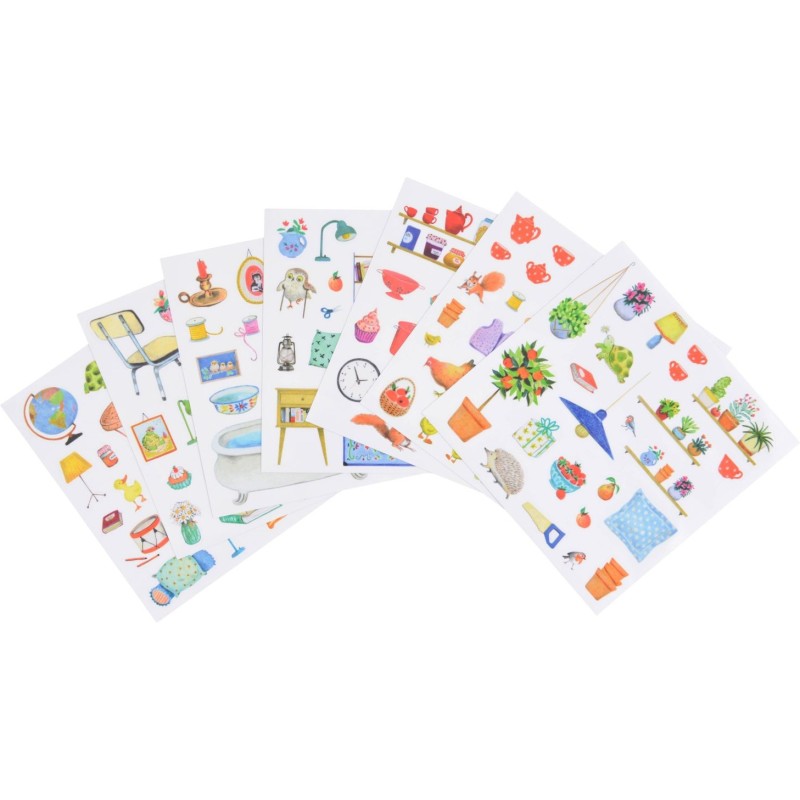 Cahier de coloriage de 20 pages représentant différents espaces à aménager à l'aide de 160 stickers colorés. 5 planches d'animaux, d'objets, de mobilier, de végétaux à coller pour créer ses univers.