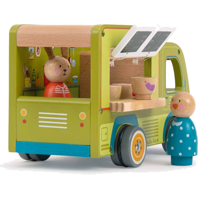 Ding-dong ! Le camion-restaurant de la Grande Famille est prêt à vous servir ses bons petits plats : soupes et tartines comme à la maison ! Tout en bois et entièrement illustré, il roule et comprend une fenêtre ouvrante pour accueillir les clients. Personnages vendus séparément.