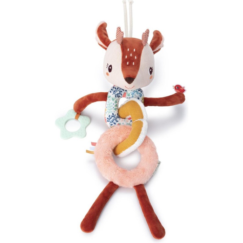 Cette guirlande souple comporte une multitude d'activités pour stimuler les sens de votre petit bout. Des bruits de cliquetis ou de crépitement, des matières variées, un anneau de dentition… autant d'éléments qui encouragent les tout-petits à explorer. Les anneaux de la guirlande sont détachables. Facile à attacher grâce à la ficelle prévue à cet effet.
