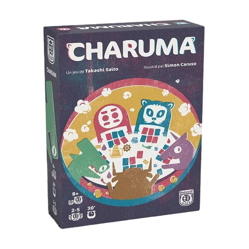 Charuma est un jeu de plis astucieux avec une part de prise de risques. - Commencez par construire votre main dans une phase d'enchères rapides en utilisant vos points de victoire. Votre main comporte alors 8 cartes, dont 6 visibles sur la table et 2 cachées dans vos mains. - Puis, enchaînez les plis en fonction des cartes que vous voyez chez vos adversaires. Chaque carte inconnue vous forcera à prendre des risques pour créer des moments forts autour de la table. Pour gagner la partie, il vous faudra gérer vos dépenses de points de victoire pour récupérer les cartes qui vous intéressent et vos gains en fin de manche.