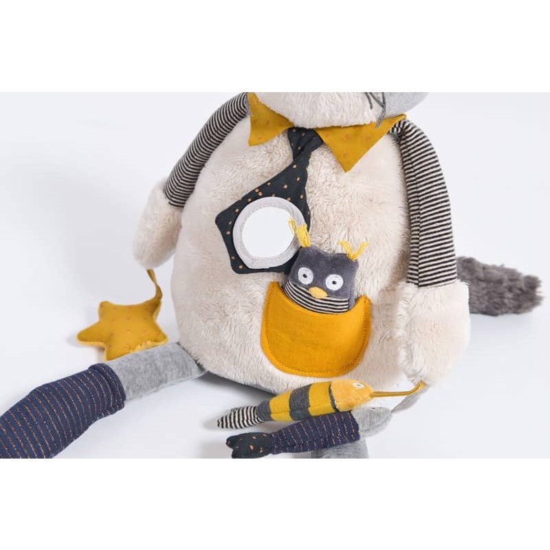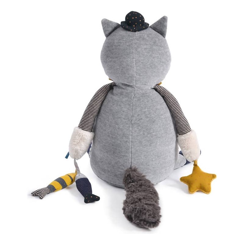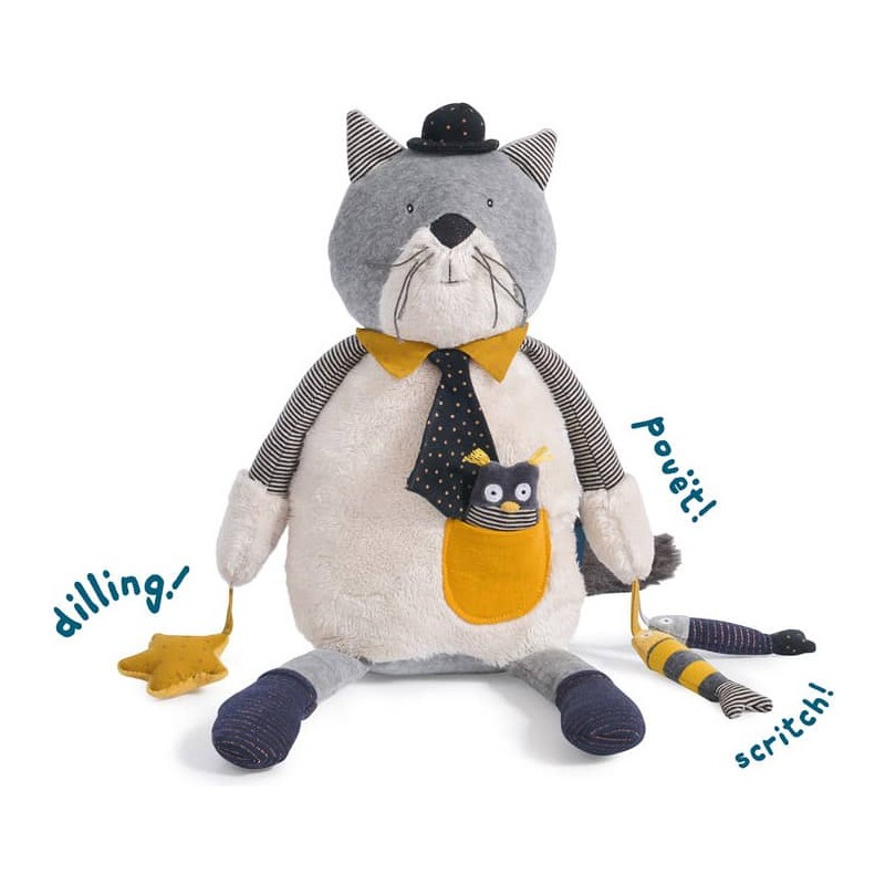 Un beau chat aux multiples talents : pouet-pouet, hochet, plastique qui fait du bruit, miroir… et ses amis les poissons, son petit hibou et les étoiles.