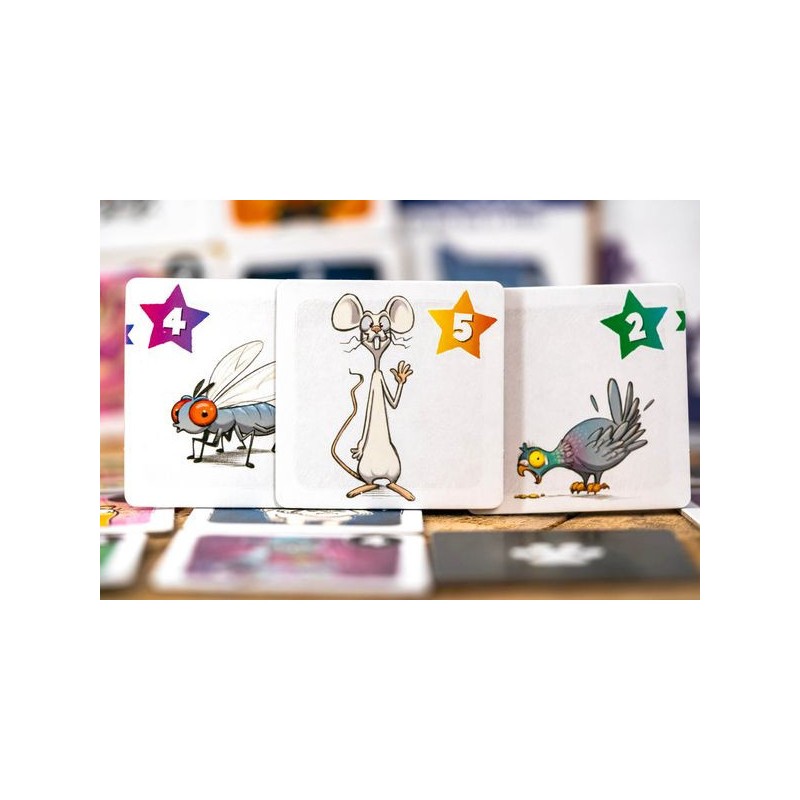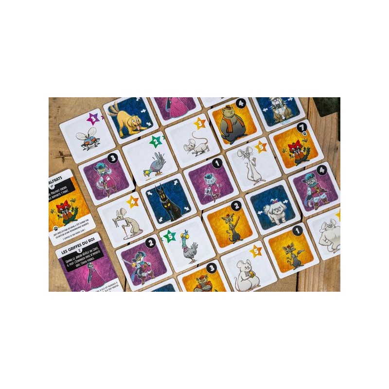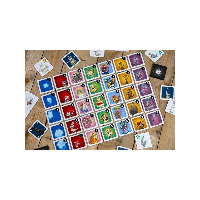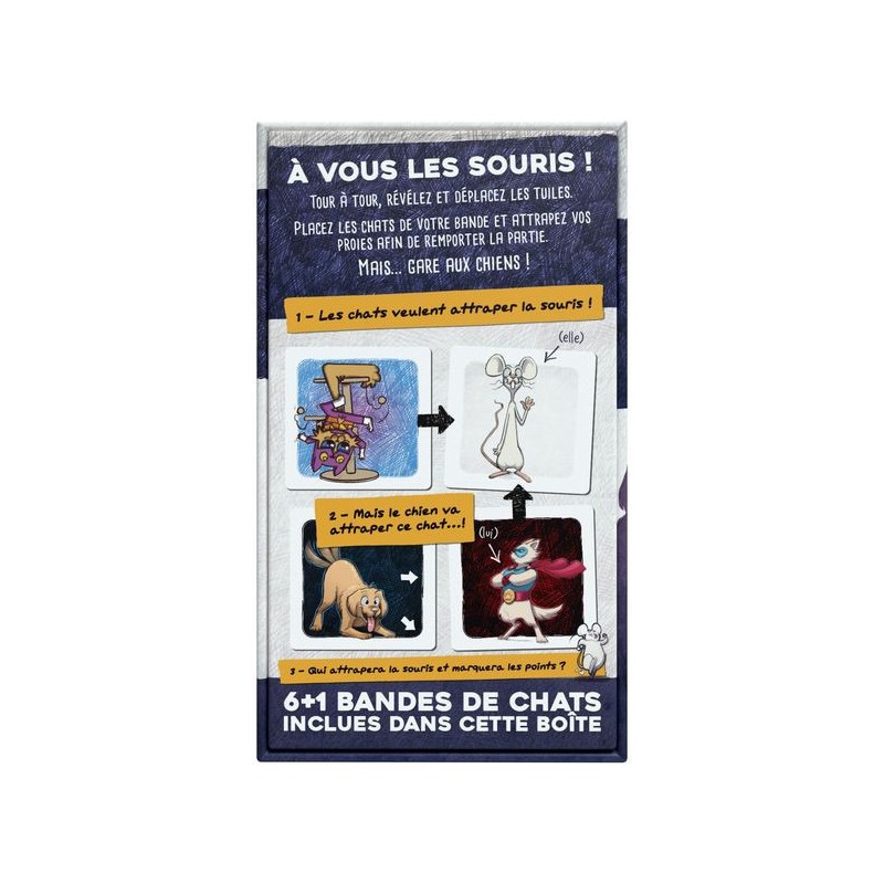 À vous les souris ! Tour à tour, révélez et déplacez les tuiles. Placez les chats de votre bande et attrapez vos proies afin de remporter la partie. Mais... gare aux chiens !