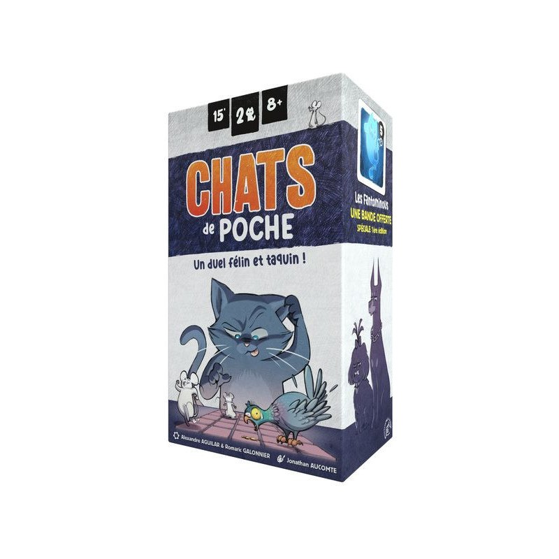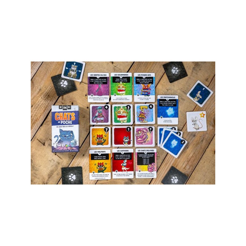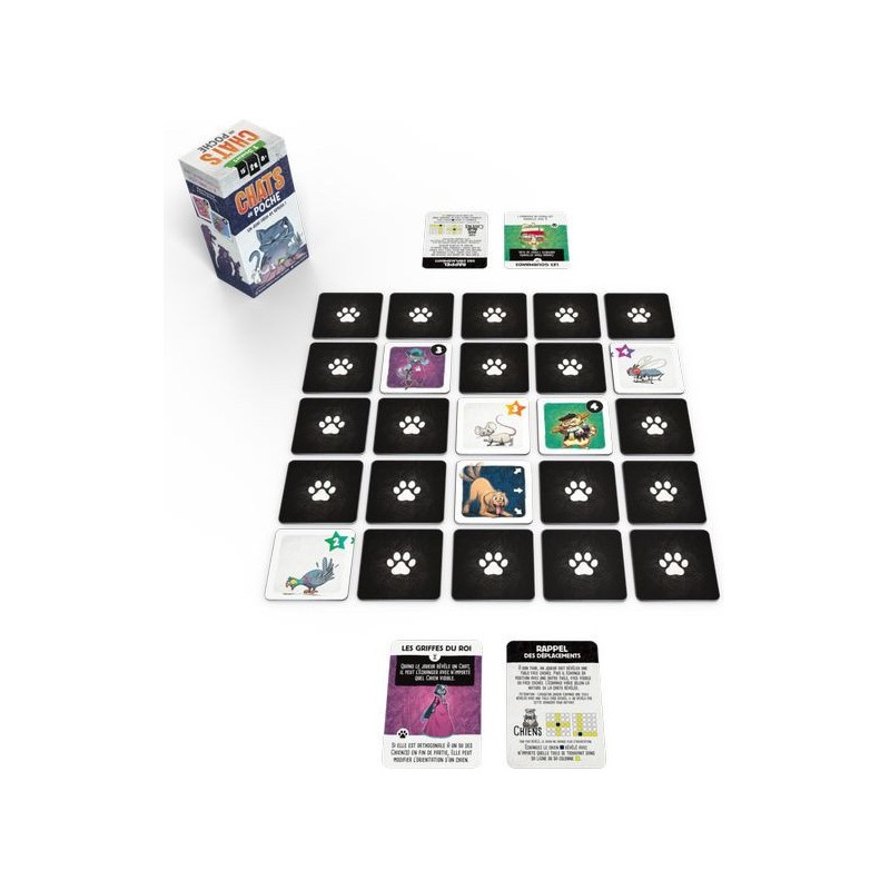 Dans Chats de poche vous prenez les rênes d'un clan de félins et partez à la chasse aux proies dans un jeu rempli d'action ! Il vous faudra poursuivre pigeons, mouches et souris tout en esquivant les chiens du quartier. Plongez dans un duel félin plein de taquineries, où l'opportunisme et l'optimisation sont de mise pour remporter des parties courtes et intenses. Préparez-vous à vivre des aventures palpitantes et des moments de stratégie féroces dans ce jeu captivant pour petits et grands amateurs de jeux de société.