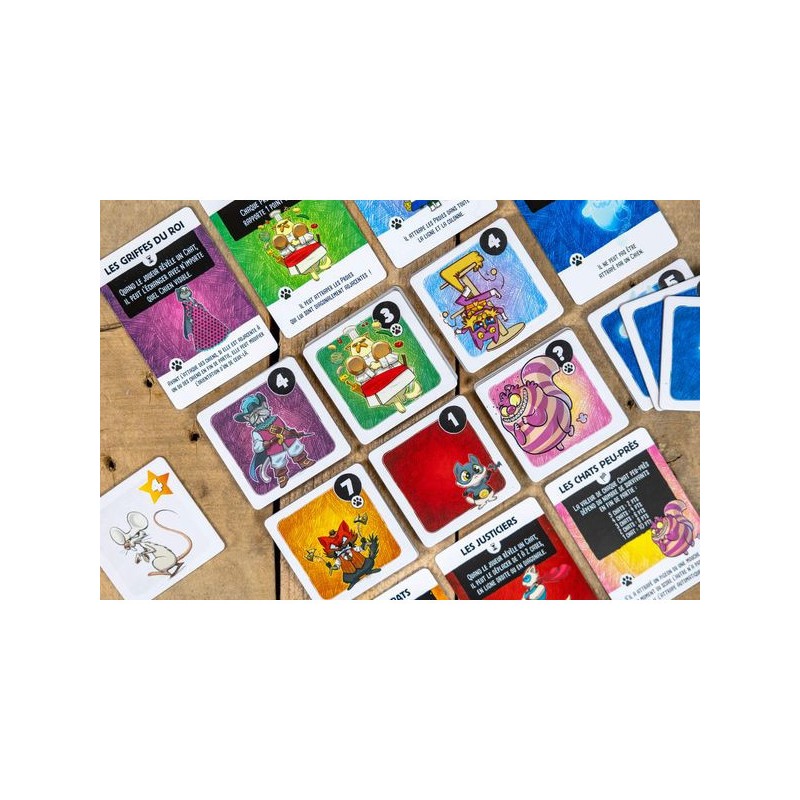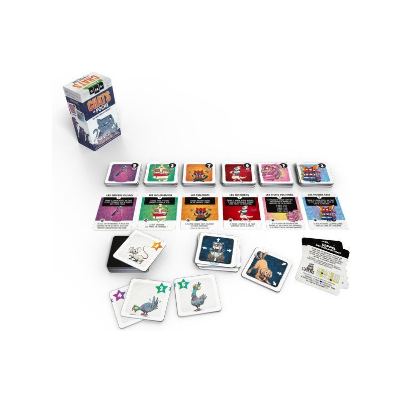 Contenu : 35 tuiles Chat, 10 tuiles Proie, 5 tuiles Chien, 6 + 1 cartes Bande, 2 cartes Aide de jeu,