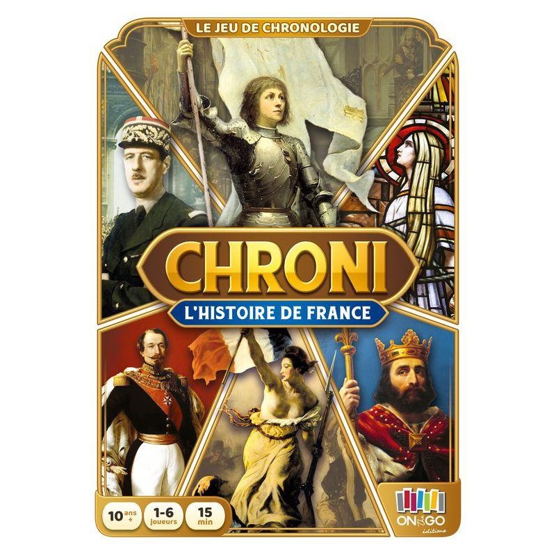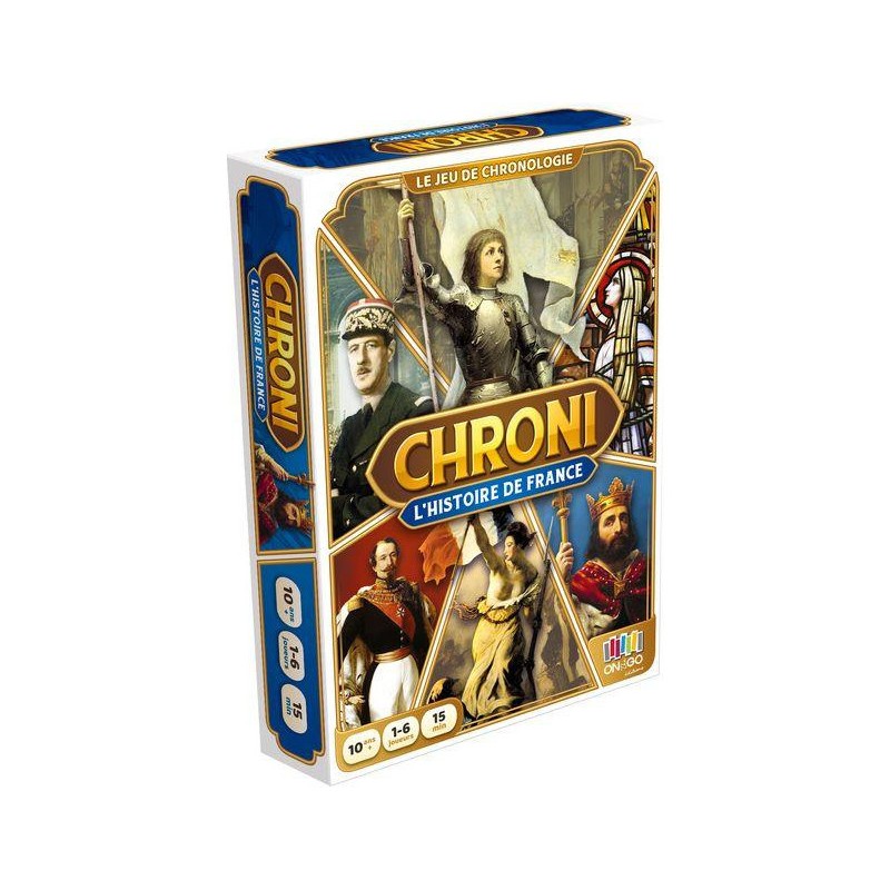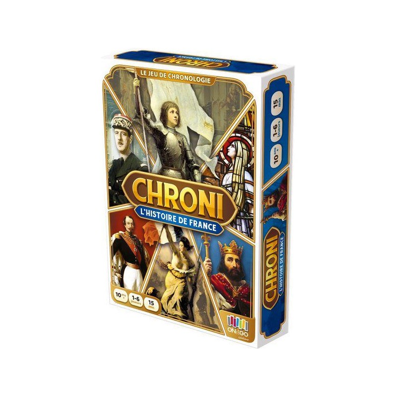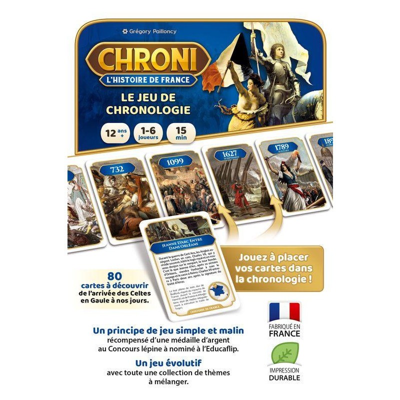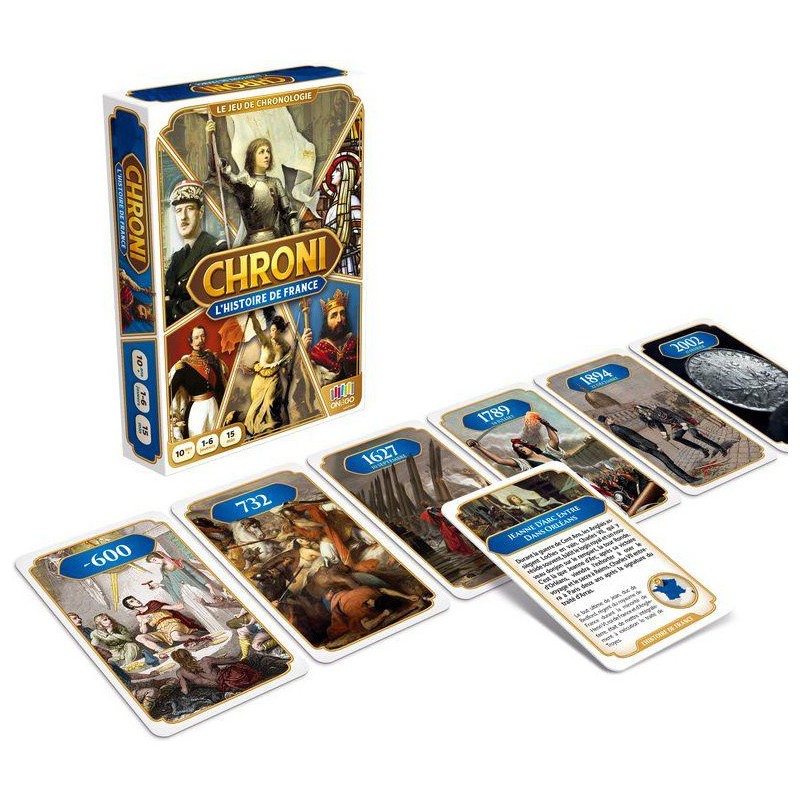 Chroni - Histoire de France est un jeu de cartes conçu pour améliorer et tester sa culture générale en explorant les événements marquants de l'histoire de France. De l'arrivée des Celtes (vers -700) à la disparition du franc en 2002, le jeu propose une sélection de 80 évènements incontournables de notre passé historique. Le jeu se distingue par un principe de jeu simple et astucieux qui a été récompensé d'une médaille d'argent au Concours Lépine. Chaque joueur, à son tour, tente de placer une de ses cartes dans la frise chronologique. L'objectif est d'être le premier à se débarrasser de toutes ses cartes. Cependant, il faut faire preuve de prudence et de précision, car en cas d'erreur, on doit piocher une nouvelle carte, ce qui ajoute une dose de suspense et de challenge à la partie.