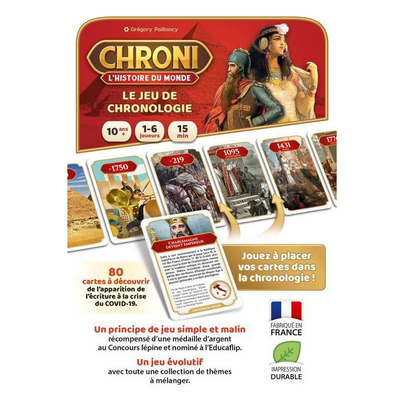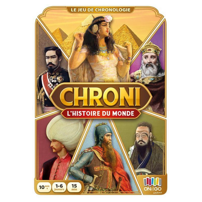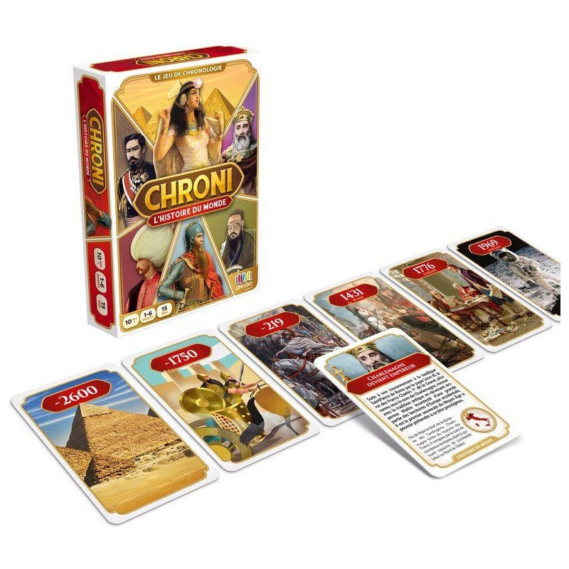 Chacun son tour, un joueur tente de situer une de ses cartes dans la frise chronologique. Le premier à ne plus avoir de carte dans sa main remporte la partie. Mais attention si on se trompe, on pioche. De la connaissance, de la déduction mais aussi un peu de chance permettent de gagner. Mais la mécanique est basée sur l'apprentissage par l'erreur. "Je ne perds jamais. Soit je gagne, soit j'apprends" -Nelson Mandela Chroni est un jeu instructif et évolutif avec toute une collection de thèmes à mélanger.