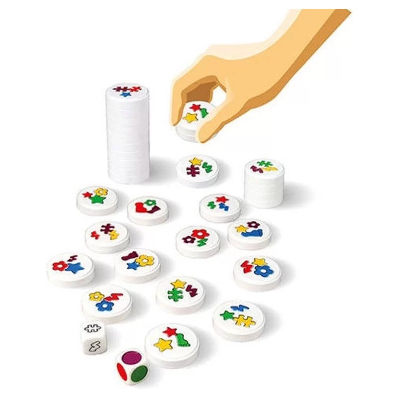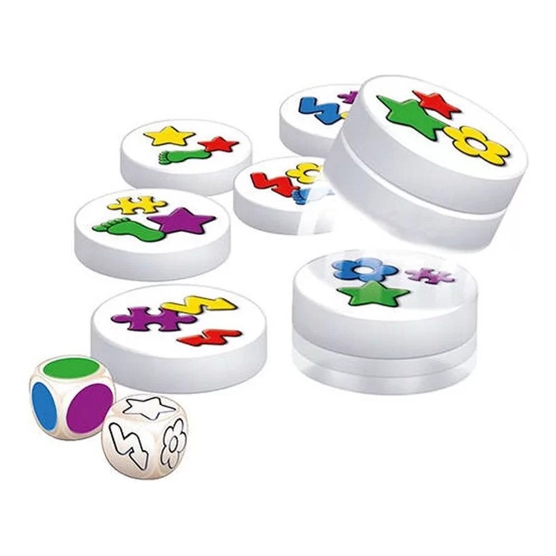 À chaque manche, deux dés désignent une couleur et une forme que les joueurs doivent retrouver. Tous en même temps, ils scrutent les disques étalés sur la table pour attraper ceux correspondant exactement à la combinaison.