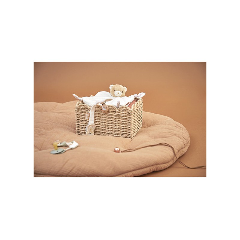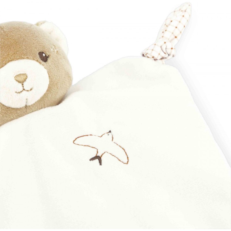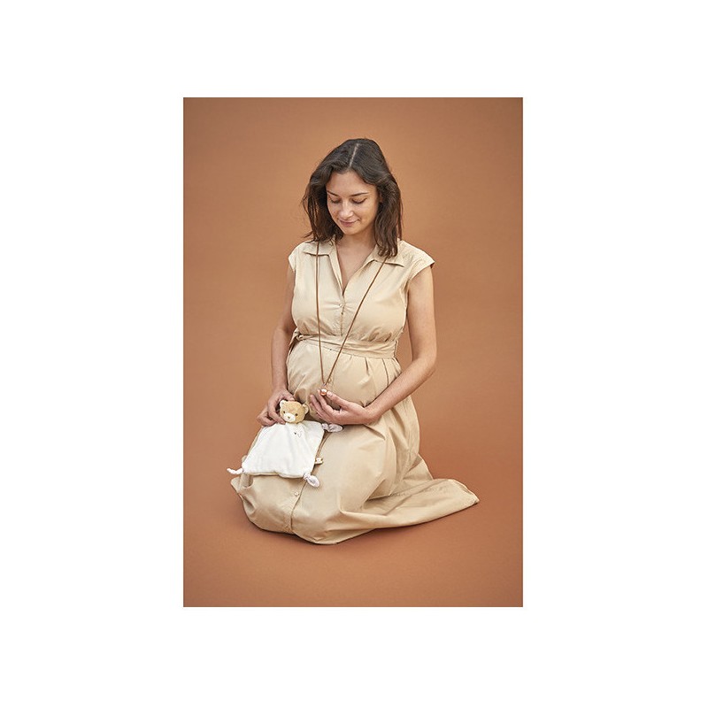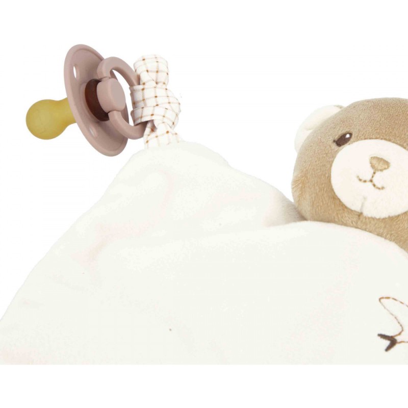 En plus d’être rassuré par cette bulle d'amour, bébé s’éveille aux sons. Avec sa texture douce et confortable, ce doudou plat de 24 cm deviendra le compagnon câlin préféré de bébé ! Dans un élégant coloris crème, il accompagne bébé grâce à ses 4 nœuds faciles à manipuler et utiles pour y accrocher la tétine.