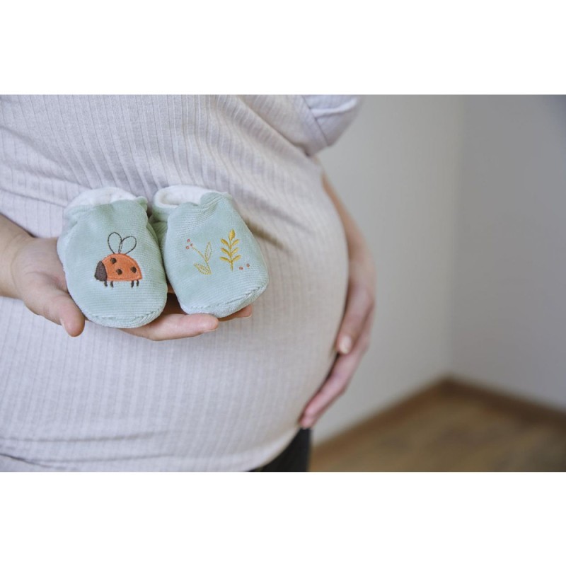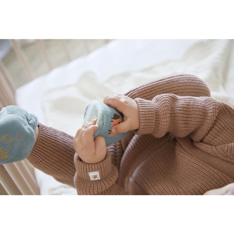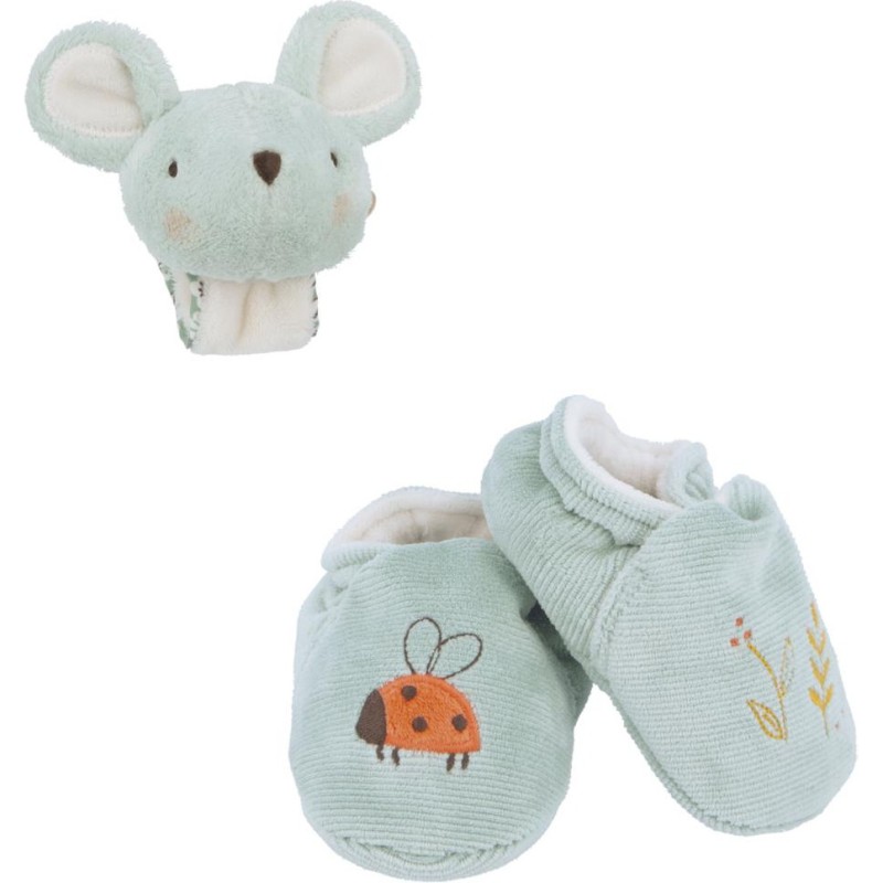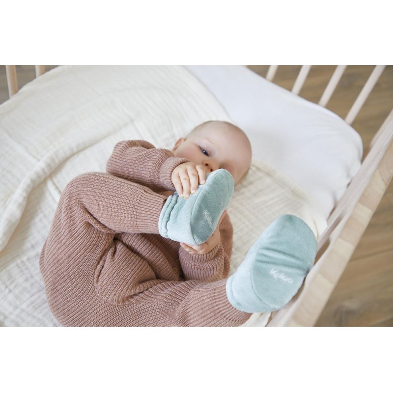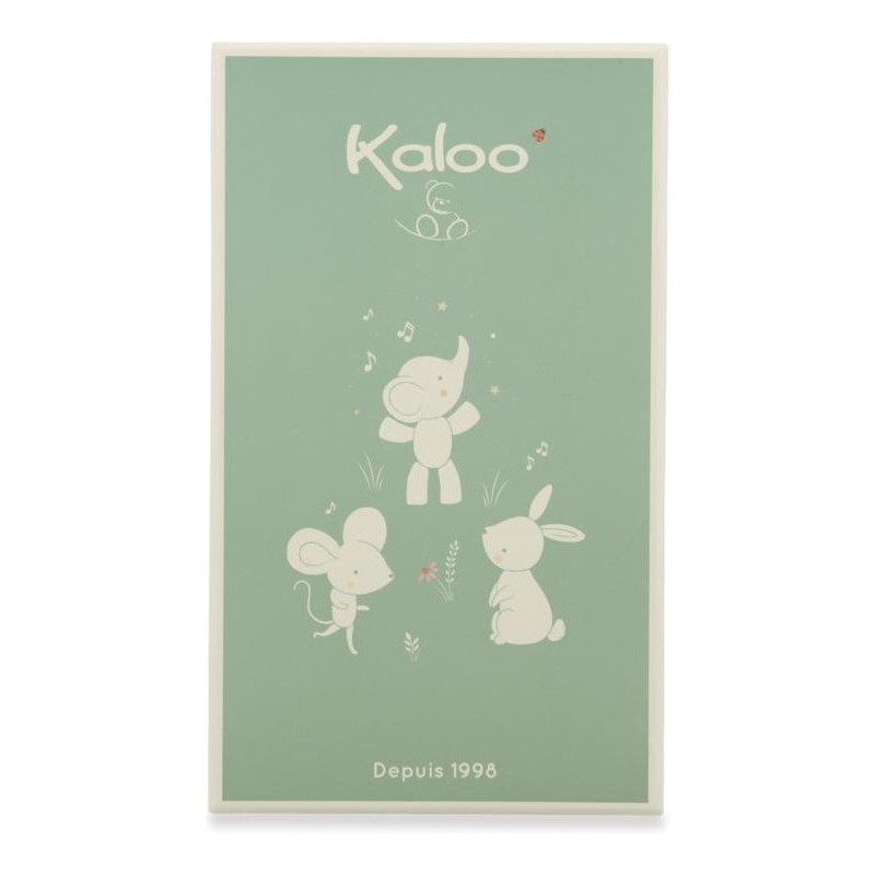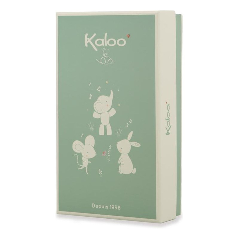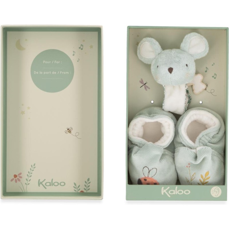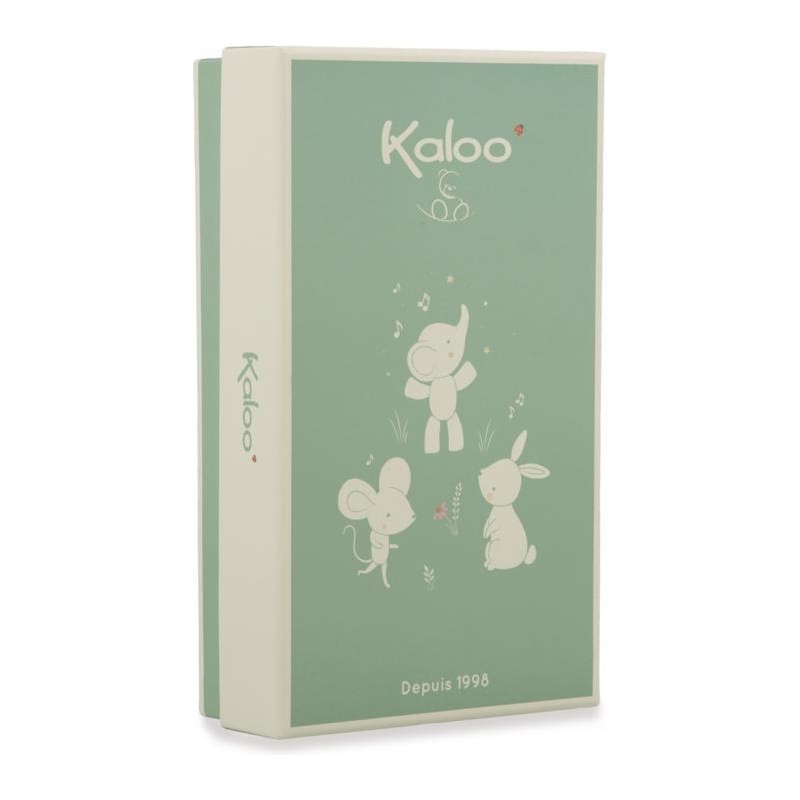 Le coffret naissance conçu pour encourager l’éveil sonore de bébé ! Composé d’un bracelet et d’une paire de chaussons avec d’intéressantes fonctionnalités, ce coffret sur le thème de la comptine « Une souris verte » est à croquer. Pour stimuler l’ouïe de bébé en douceur, et ce, dès la naissance, vous disposez ainsi de : un bracelet en micro-velours (taille 3-9 mois) avec une adorable bouille de souris en peluche et son grelot intégré, et d’une paire de chaussons en velours côtelé et décorés de broderies sur le thème de la comptine (12x4 cm). L’un des deux chaussons intègre également un grelot, pour volontairement encourager la motricité de bébé et lui permettre de renforcer sa proprioception et de découvrir le concept de cause à effet. En portant son bracelet éléphant et ses chaussons, et en agitant ses pieds et ses mains, bébé produit des sons et apprend à être curieux, le tout accompagné par son parent. Le bracelet est doux, respectueux de la peau sensible de bébé et se ferme facilement grâce à des attaches scratch. Pour un cadeau de naissance ludique, doux et original, offrez ce joli coffret cadeau personnalisable grâce à l’encart prévu à cet effet sous le couvercle. La boîte peut être réutilisée comme boîte de rangement pour les petites affaires de bébé. Composés de micro-velours, de velours côtelé, de popeline, de fourrure synthétique et de rembourrage en polyester recyclé, les chaussons et le bracelet souris se lavent en machine à 30°. Ce coffret chaussons et bracelet sonores souris fait partie de la collection Petites Chansons de Kaloo : une gamme dédiée à l’éveil aux sons, développée avec une équipe de psychomotriciens et composée d’une variété de sonorités pour stimuler bébé.