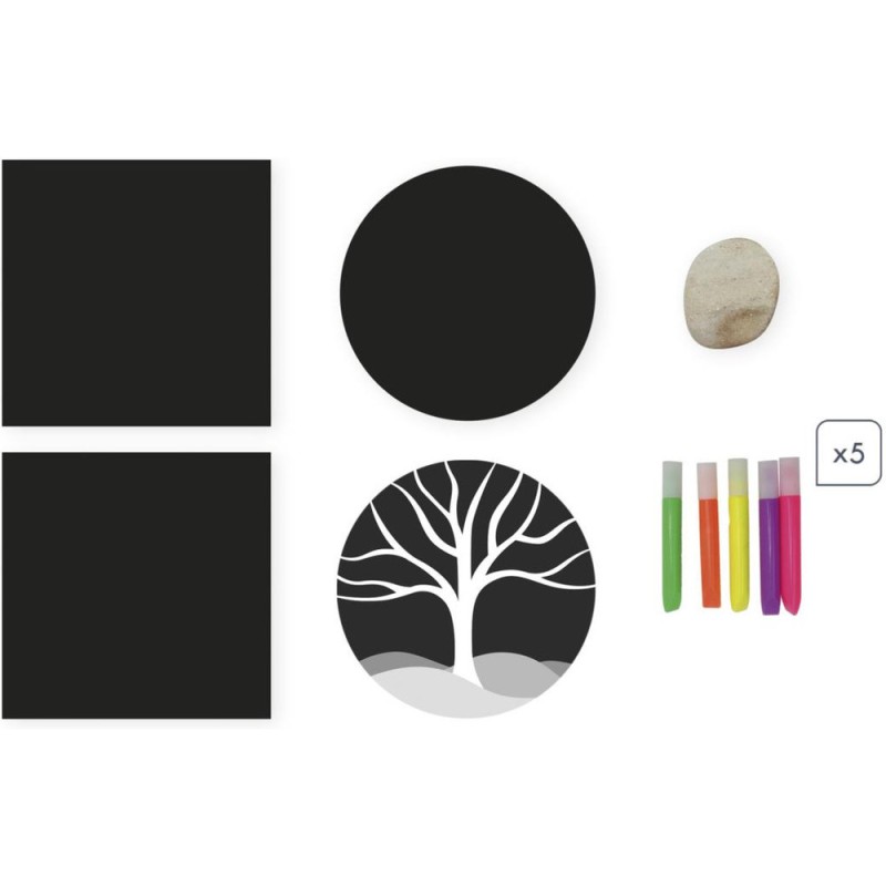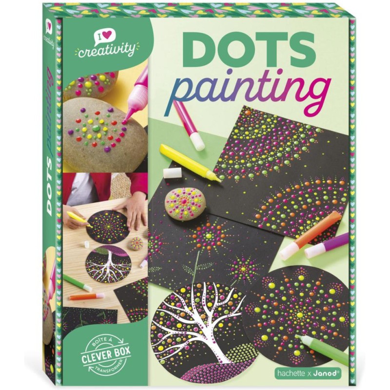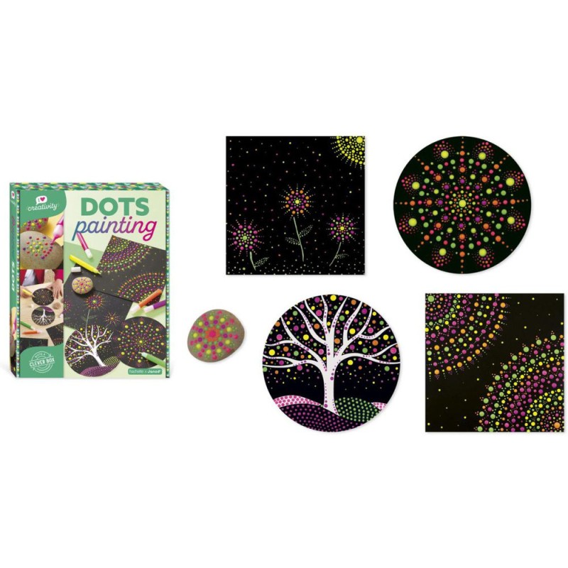 Apporte vie et couleurs à des tableaux noirs grâce à la technique de la peinture aux points, elle est hyper tendance ! Ce coffret créatif permet de décorer 4 tableaux noirs et un galet avec des points de peinture en relief de différentes tailles. 5 tubes de peinture 3D et un outil en bambou sont inclus pour permettre aux enfants dès 8 ans de travailler de jolis tableaux tout en finesse et en précision. En suivant le guide d'instructions pour découvrir cette technique et en laissant parler leur créativité, les enfants auront le plaisir de réaliser des créations qui leur ressemblent. Malin avec la Clever Box, on peut transformer la boite du kit en cadre pour une des réalisations ! Cette activité demande entre 30min et 2h par création. Elle développe la créativité et la motricité fine. Elle fait partie de la gamme-Love Creativity qui donne aux plus grands toutes les clés pour exprimer leur créativité !