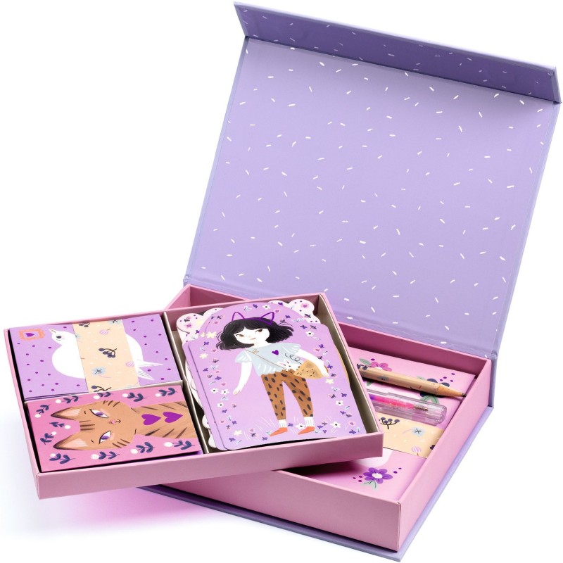Un coffret de papeterie complet. Les écrivains en herbe aimeront y noter idées et pensées, ou dessiner et décorer avec les stickers. Lovely Paper by Djeco, une collection de papeterie raffinée et délicate aux jolies illustrations.