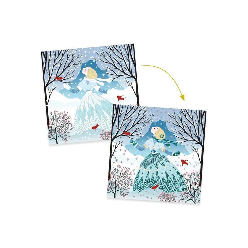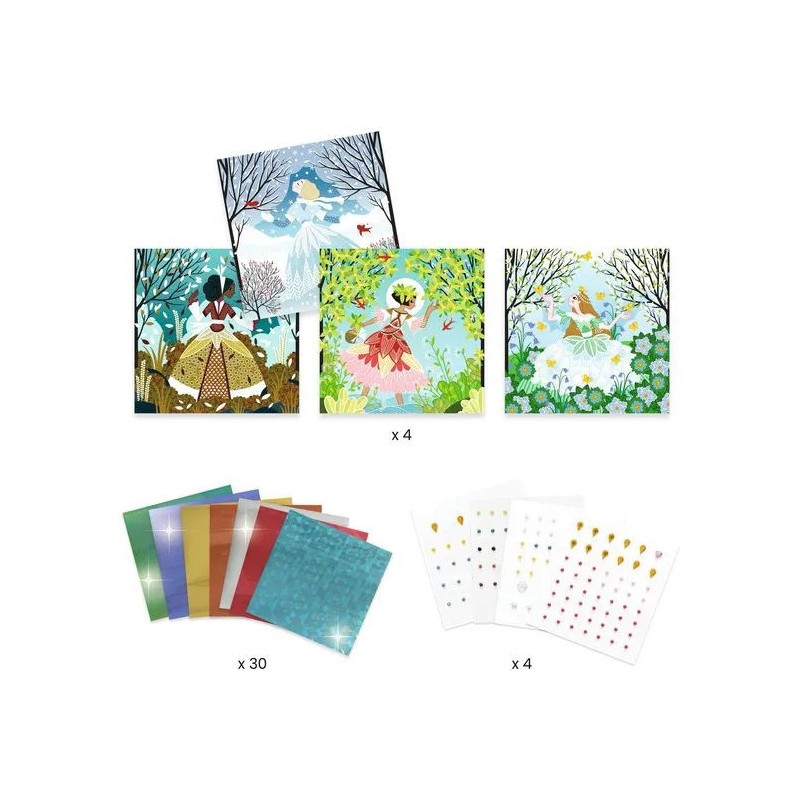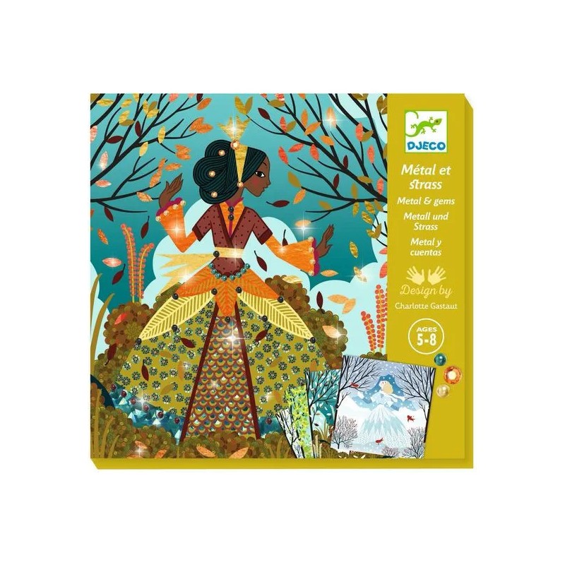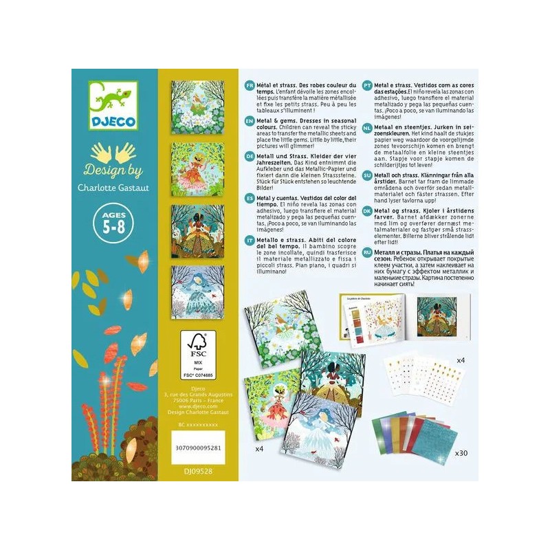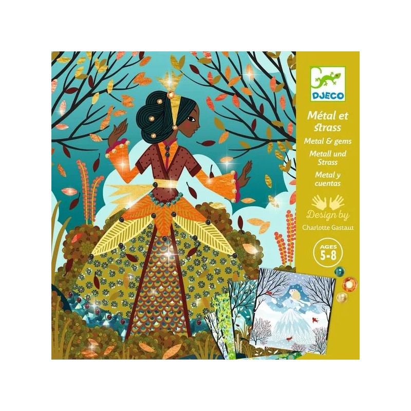 Contenu : 4 cartes illustrées et préencollées (20 x 20 cm), 1 assortiment coloré de feuilles de métal à déposer, des strass autocollants, 1 livret d'explications pas à pas.