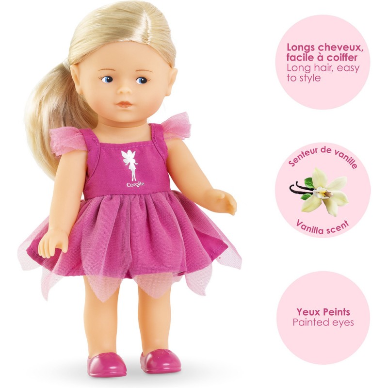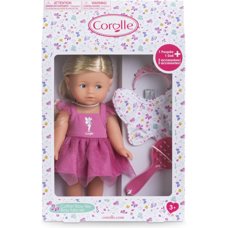 Ce coffret est composé d'une petite poupée de 20 cm "prête à offrir" et de 3 accessoires. Rosy, une petite poupée à la peau blanche, a un corps tout en vinyle doux au toucher et à la délicate senteur de vanille. Ses yeux bleus sont peints sur son visage. Elle a des longs cheveux blonds et soyeux faciles à coiffer. Rosy Fée est habillée d'une élégante robe de fée agrémentée de jolis volants rose en tulle et d'une paire de chaussures moulées roses. Elle possède 3 accessoires :