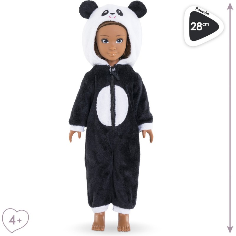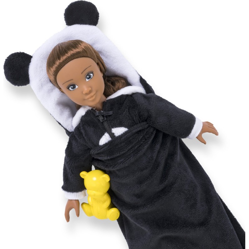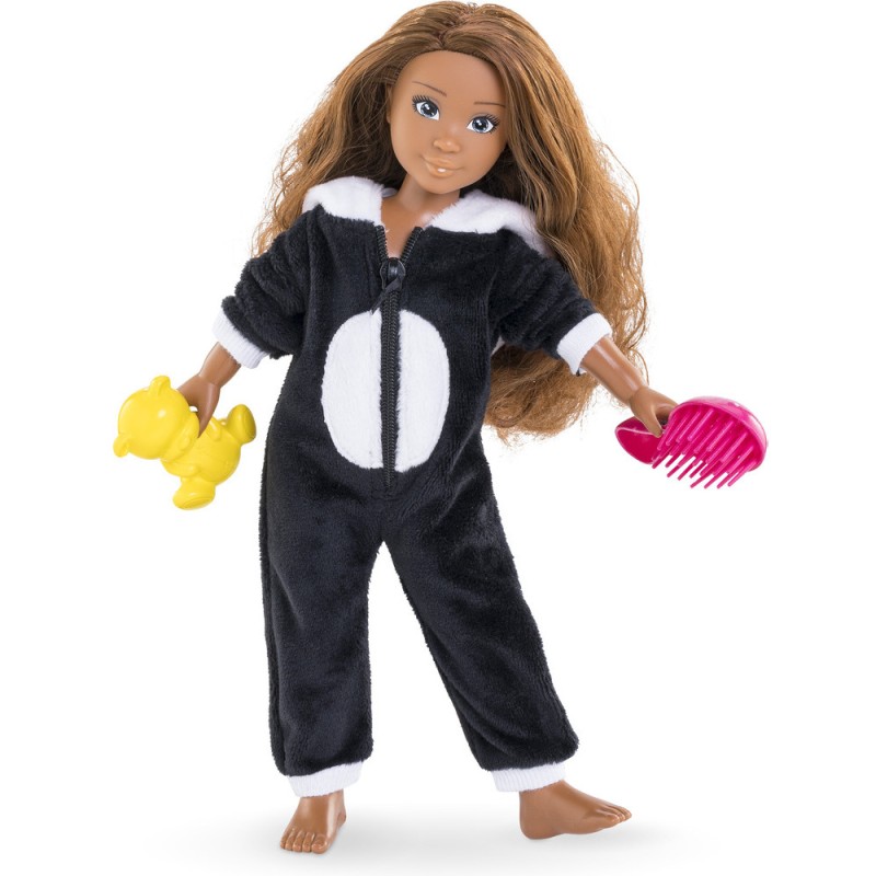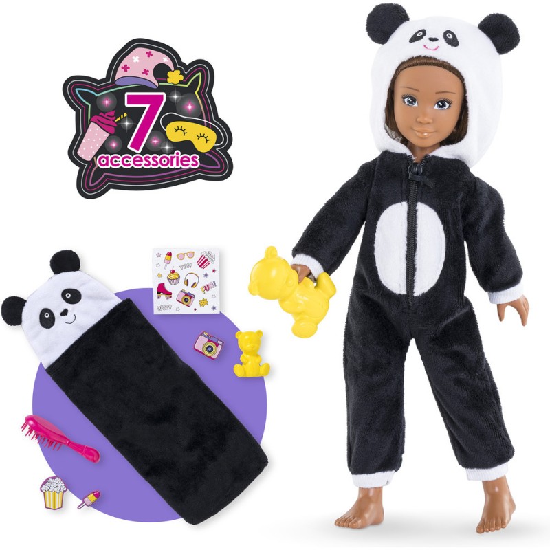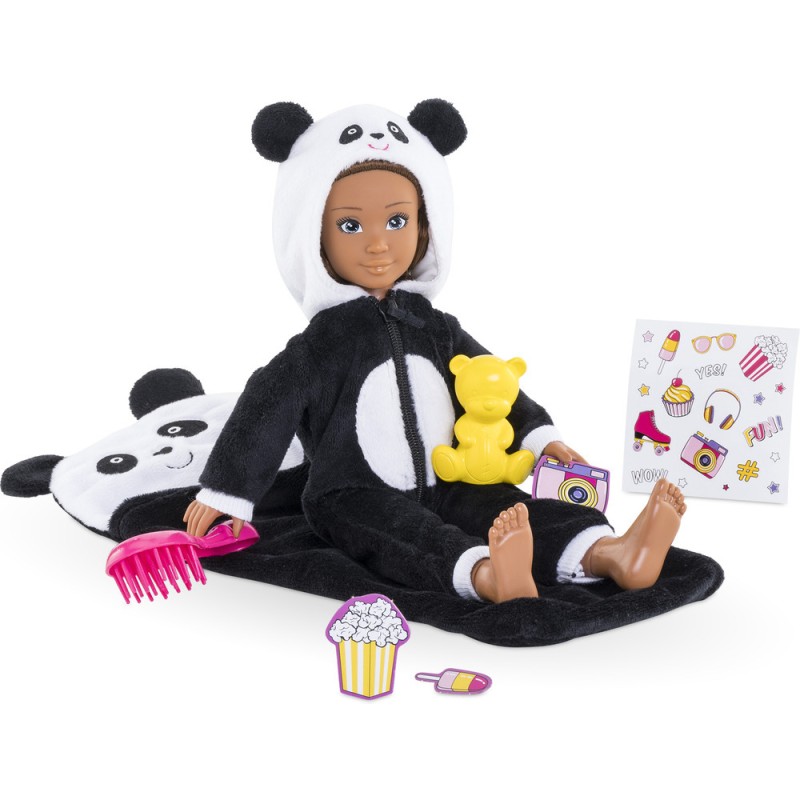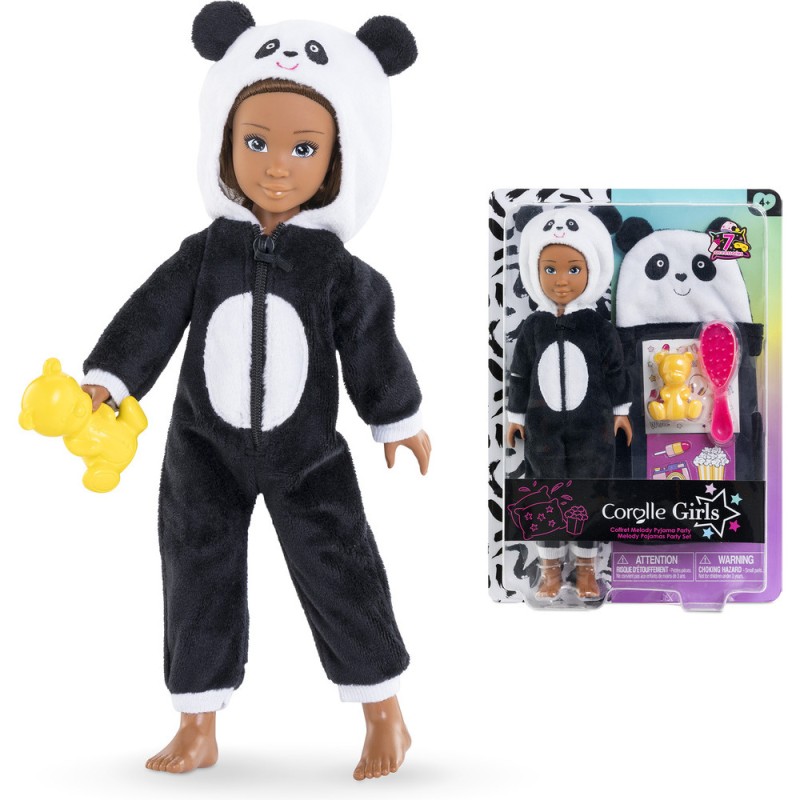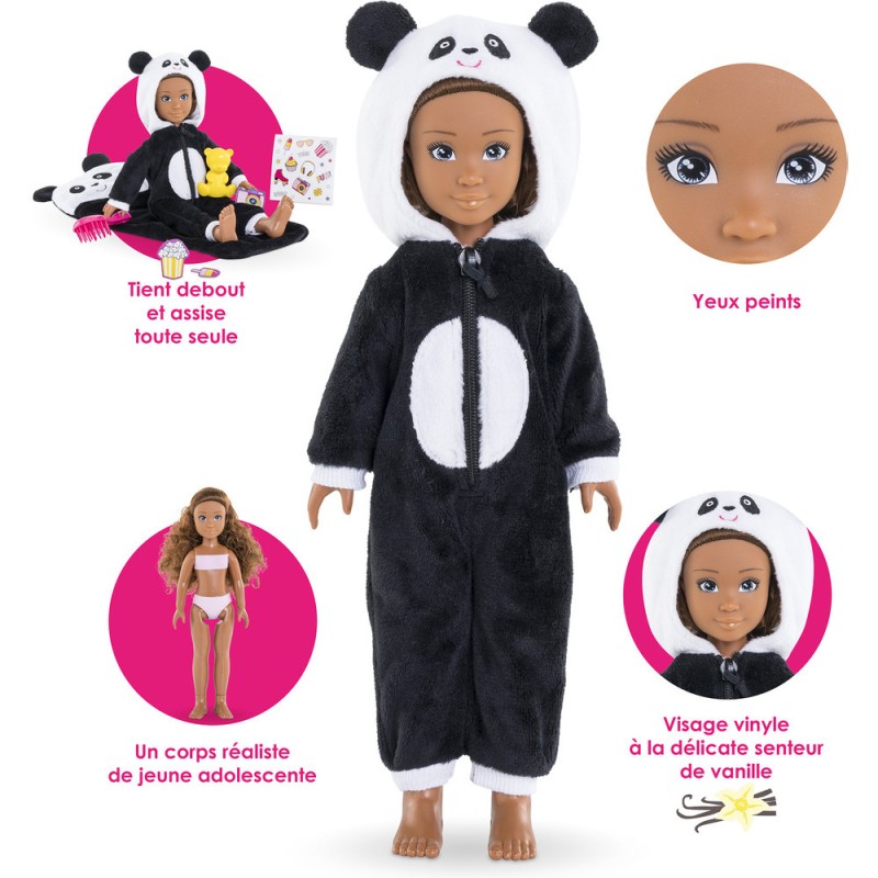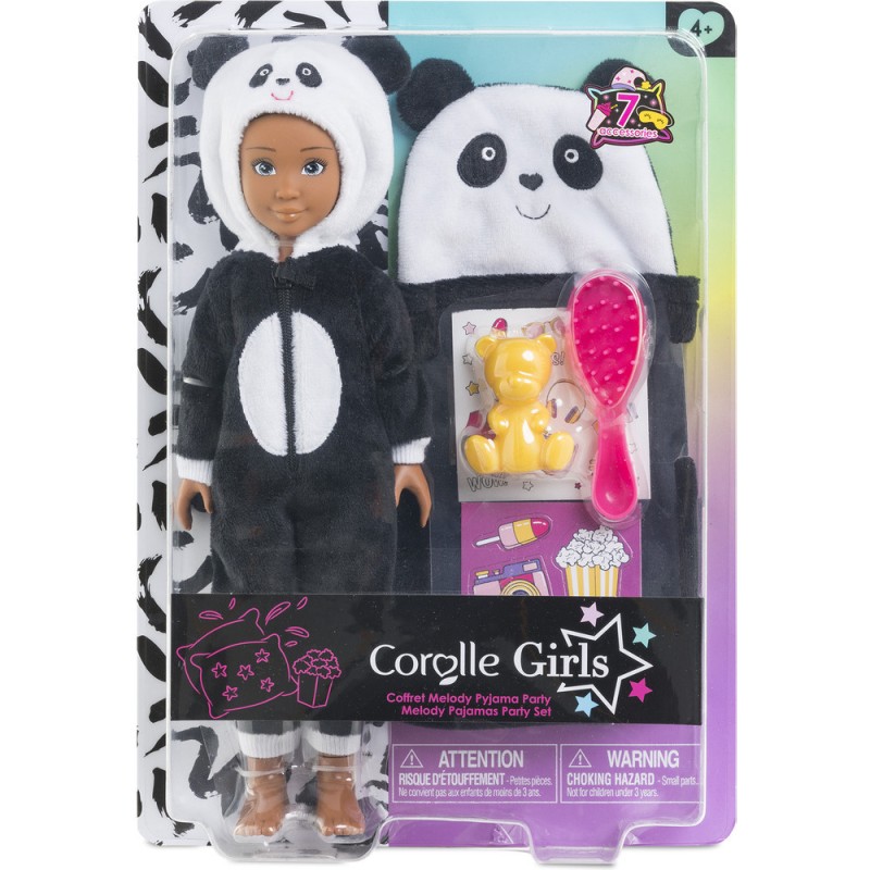 Le coffret Melody Pyjama Party est composé de Melody, une poupée mannequin de 28 cm, et de 7 accessoires : 1 sac de couchage, 1 brosse à cheveux, 1 ourson, 1 planche de stickers et 3 accessoires de jeu en carton ( 1 appareil photo, 1 glace, 1 paquet de pop-corn). Melody a un joli visage naturel aux traits fins qui sent bon la vanille. Ses yeux sont peints et elle possède de longs cheveux châtain lumineux et ondulés. Elle porte 1 combi-pyjama panda toute douce. Poupée mannequin à la peau noire, Melody a un corps réaliste de jeune adolescente. Elle tient assise et debout toute seule. Les Corolle Girls sont déclinées en plusieurs modèles et disposent de coffrets dressing pour encore plus de jeux !
