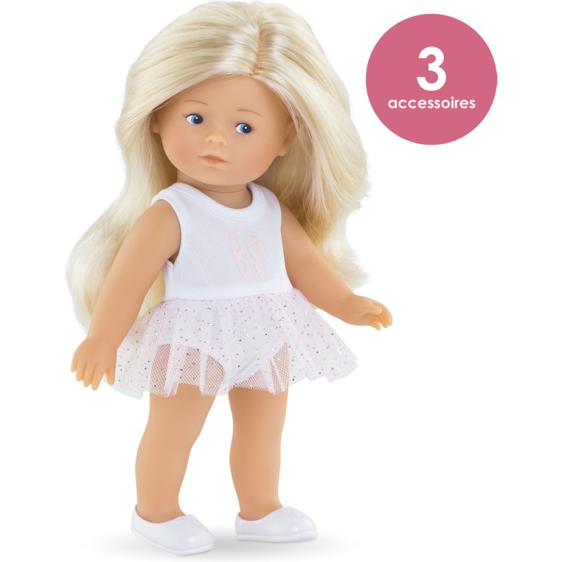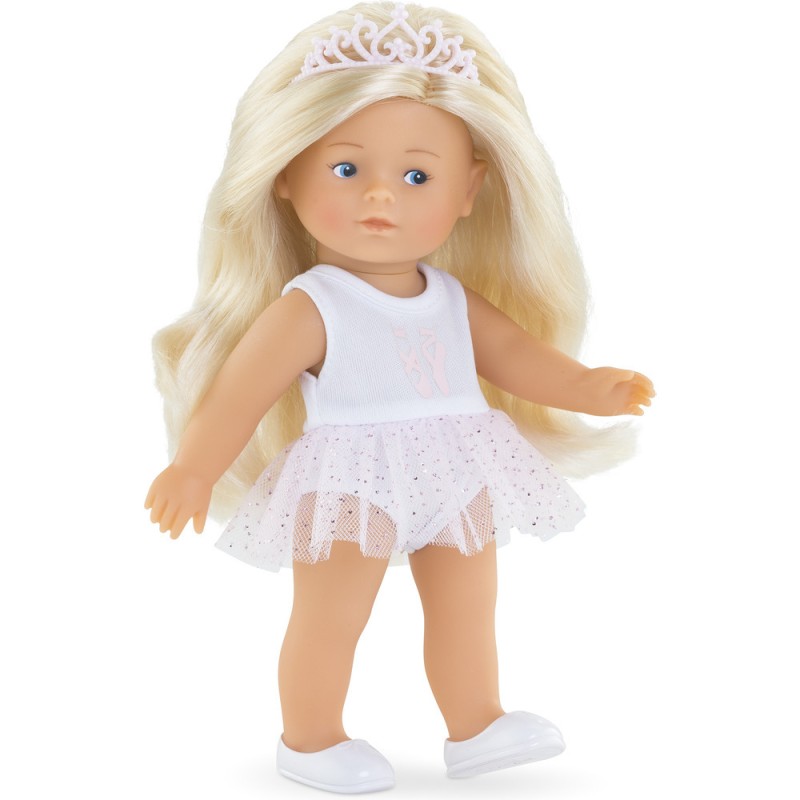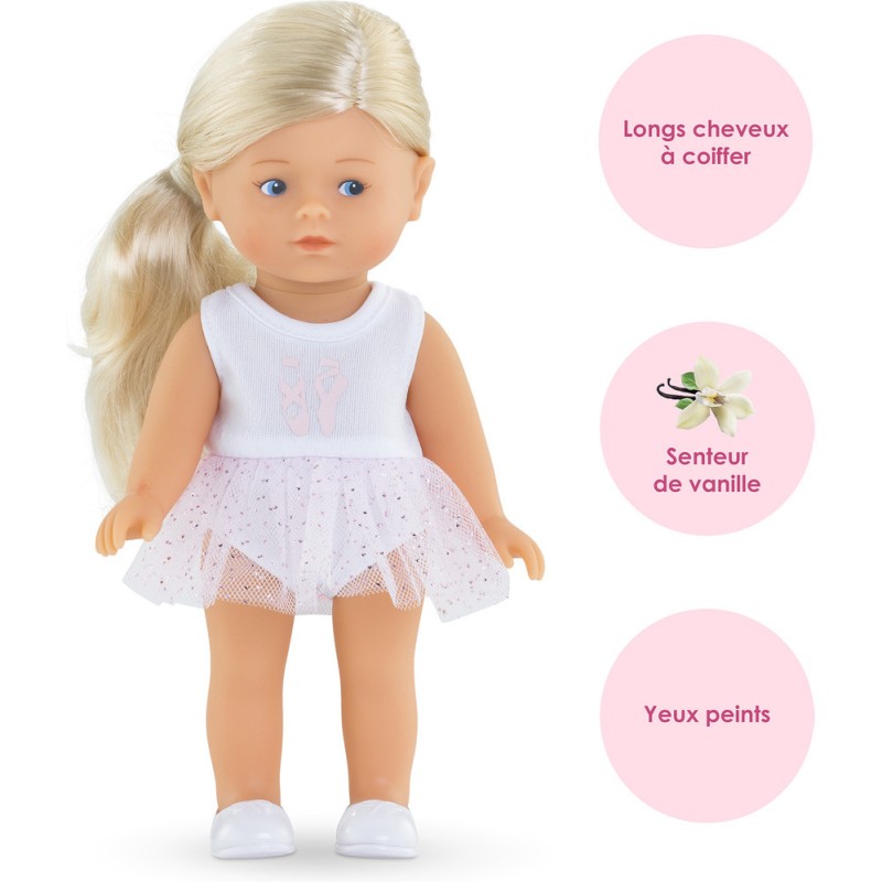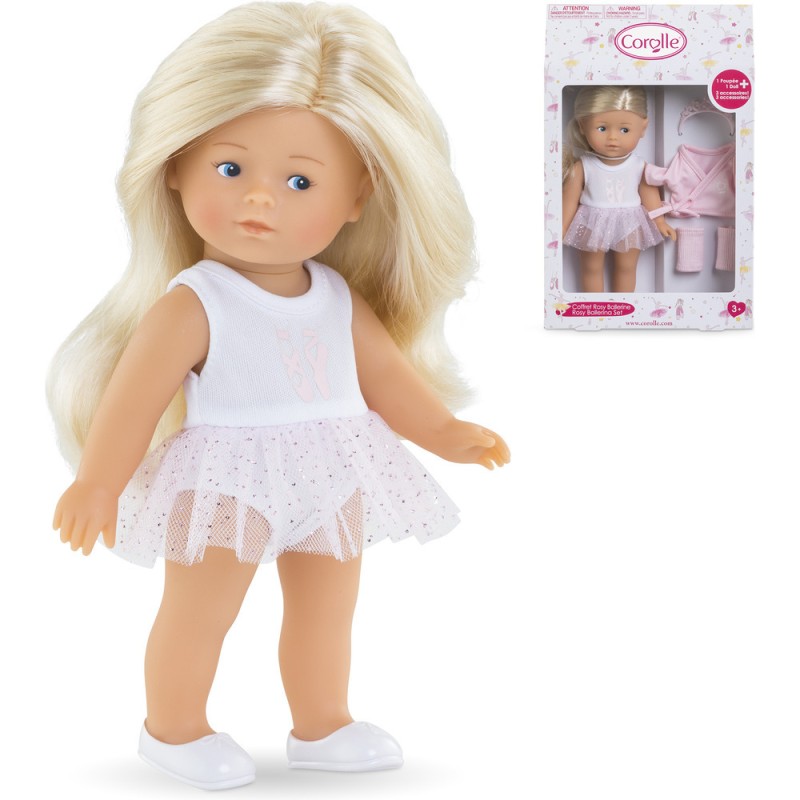 Rosy, une petite poupée à la peau blanche et les yeux bleus peints sur son visage. Elle a des longs cheveux blonds et soyeux faciles à coiffer. Elle a le corps tout en vinyle doux au toucher et à la délicate senteur de vanille. Rosy ballerine est habillée d'une élégante tenue de danse tout-un, composée d'un justaucorps et d'un joli jupon en tulle à paillettes, et d'une paire de chaussures moulées blanches. Elle porte également 1 petit gilet rose assorti à sa tenue, 1 paire de guêtres rose et 1 tiare rose.