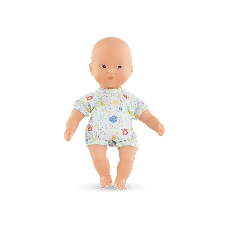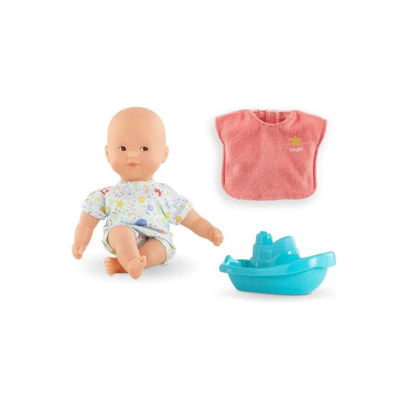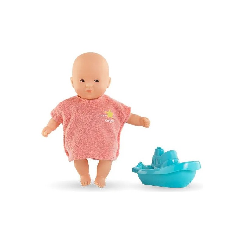 Sa cape de bain en éponge, conçue pour les petites mains dès 18 mois, est facile à enfiler. Le mini poupon a la peau blanche et les yeux marron peints : son visage, ses bras et ses jambes sont en vinyle doux au toucher, à la délicate senteur de vanille. Il possède une jolie toile de corps imprimée de motifs aquatiques.