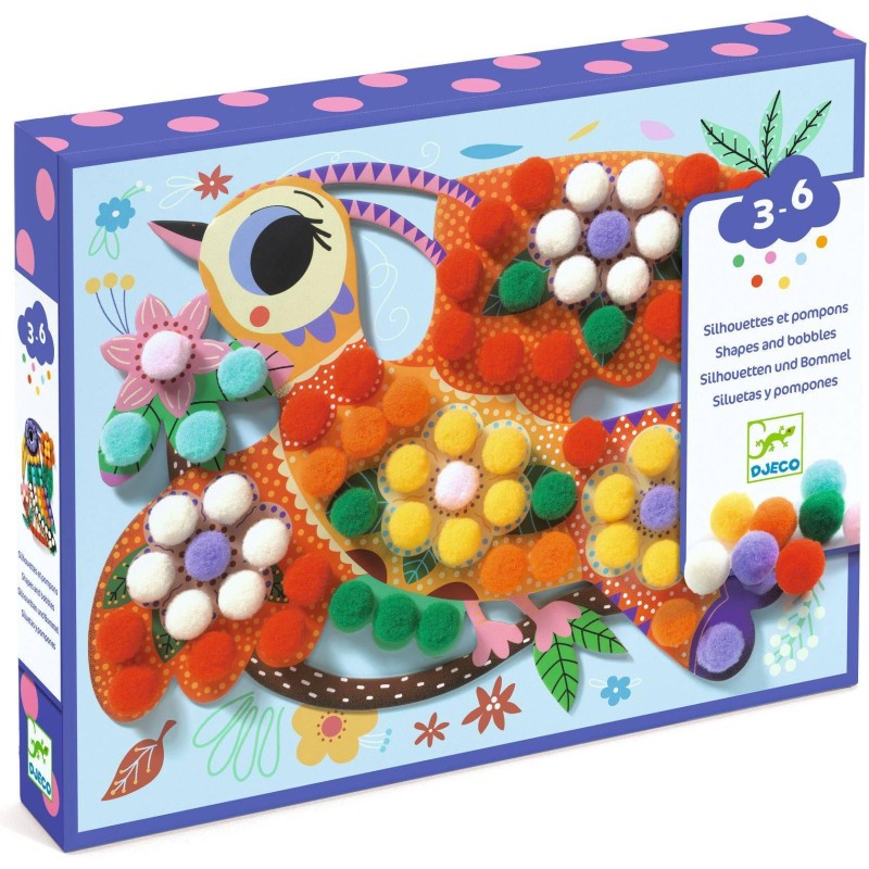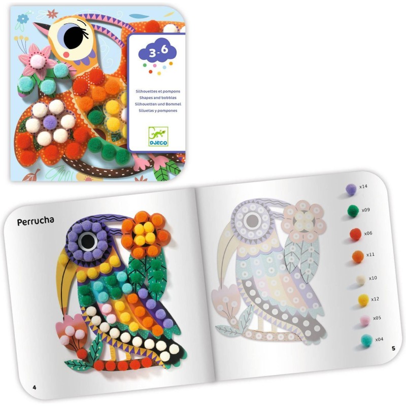 Contenu : 3 oiseaux silhouettés en carton épais, avec des zones autocollantes, 200 pompons à coller et 1 livret explicatif pas-à-pas.