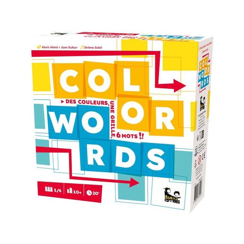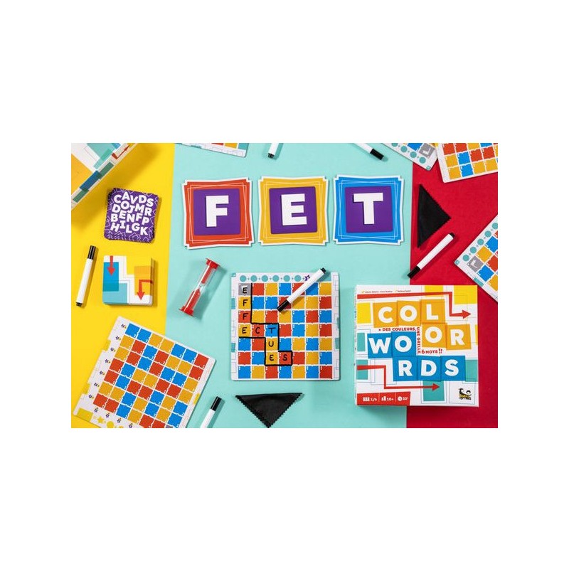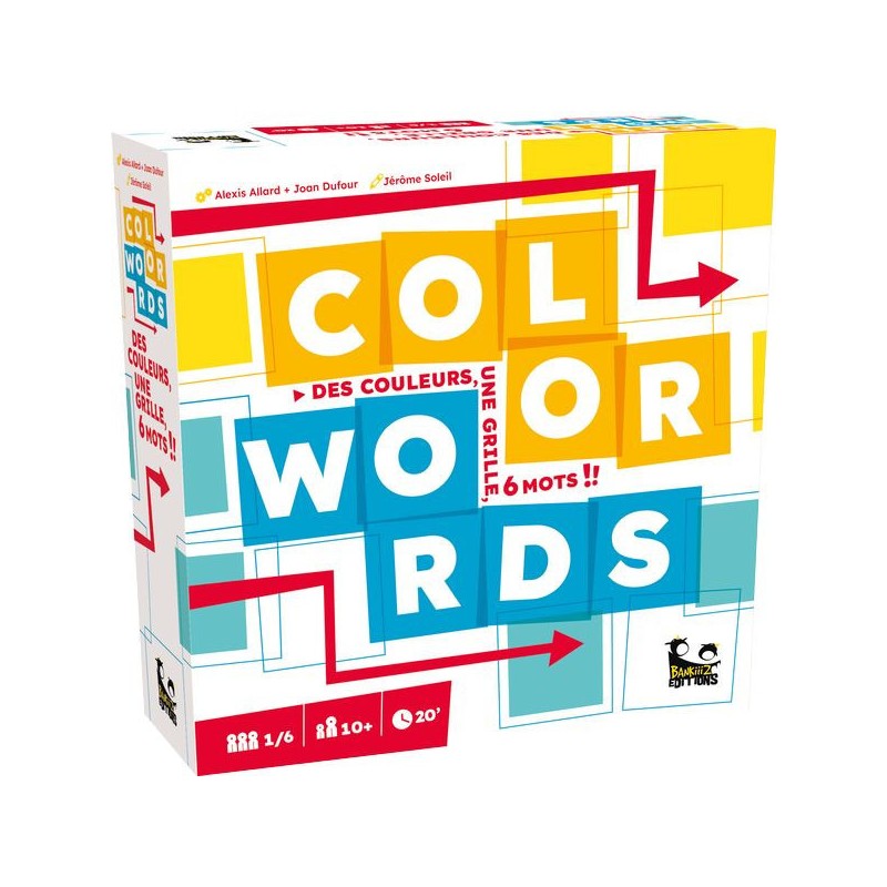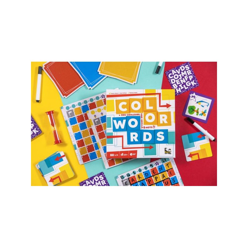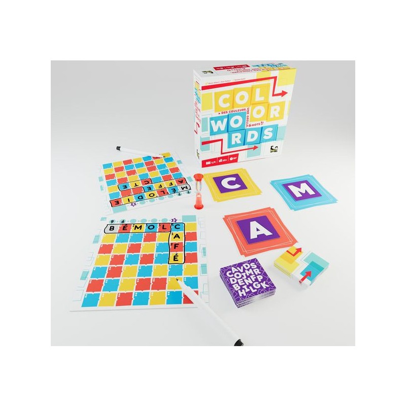 À chaque tour, on révèle 3 lettres, associée chacune à une couleur, ainsi qu'une condition à satisfaire pour gagner le Bonus : thématique, nombre de lettres, première lettre imposée, cases de couleurs… Tout le monde a 90 secondes pour trouver un mot et l'inscrire sur sa grille individuelle (en écrivant de gauche à droite et/ou de haut en bas). Chacune des lettres révélées utilisée dans un mot rapporte 1 point, et même 2 points si elle est placée sur une case de la bonne couleur ! Le bonus peut rapporter jusqu'à 4 points si la condition est respectée. Après 6 manches (et donc 6 mots), on fait la somme des points et le joueur qui en a accumulé le plus l'emporte. Laissez le moins de cases vides ou remplissez les lignes et colonnes plus vite que vos adversaires : les 2 grilles différentes proposent chacune une façon différente de gagner des points supplémentaires en fin de partie.