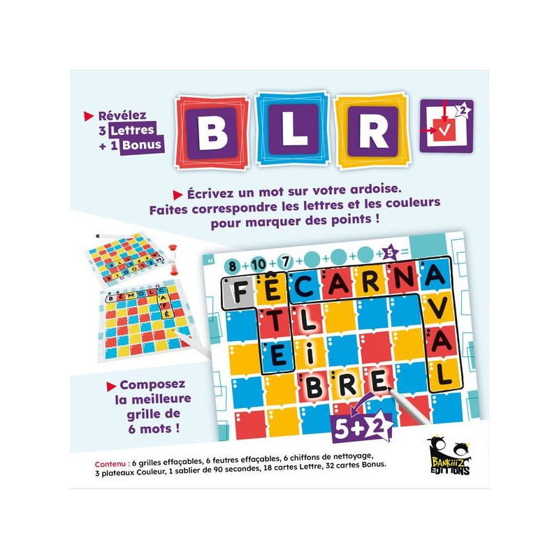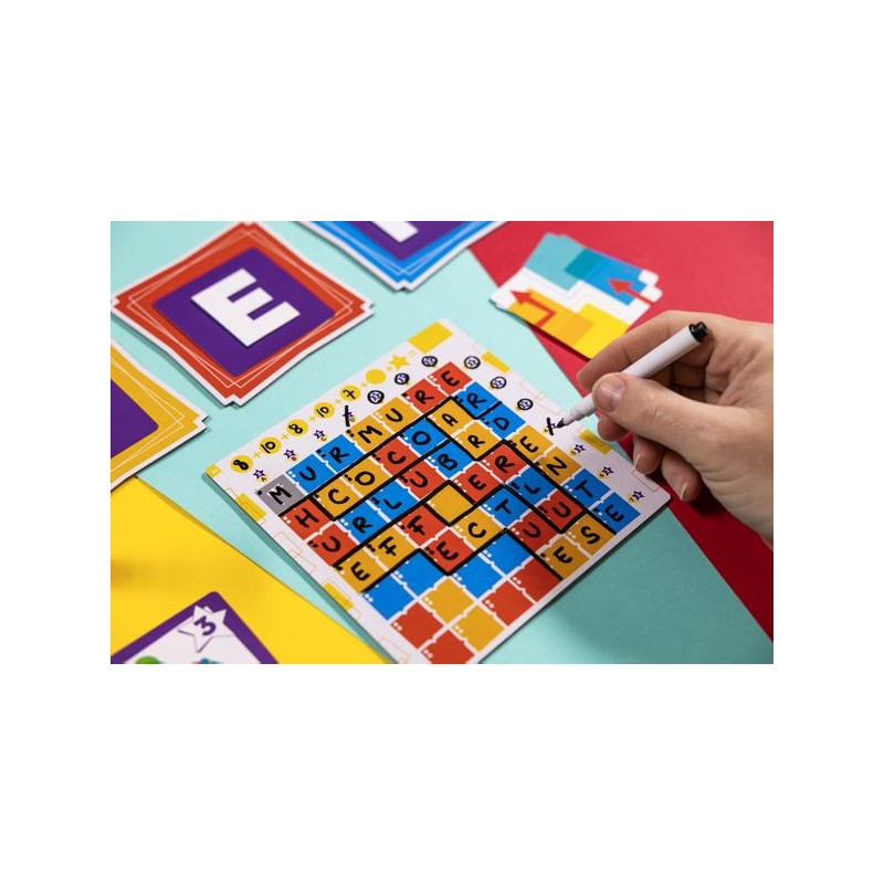 Contenu : 3 plateaux de couleur, 1 sablier de 90", 18 cartes Lettre, 36 cartes Bonus, 6 grilles effaçables recto-verso, 6 feutres effaçables, 4 chiffons de nettoyage