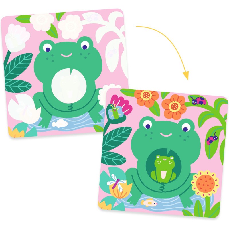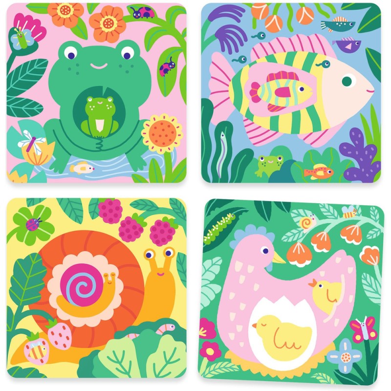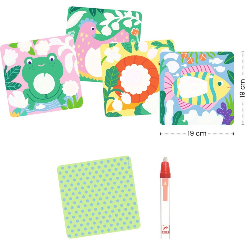 Contenu : 4 planches illustrées carrées en plastique souple avec une couche blanche qui disparaît, un crayon à reservoir d'eau et 1 support en carton épais.