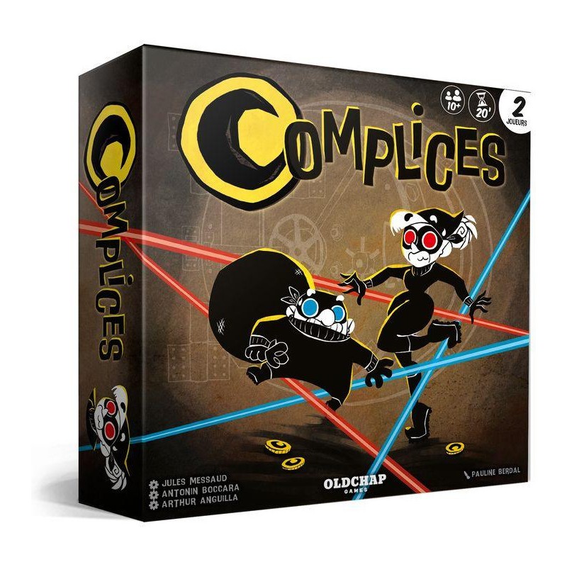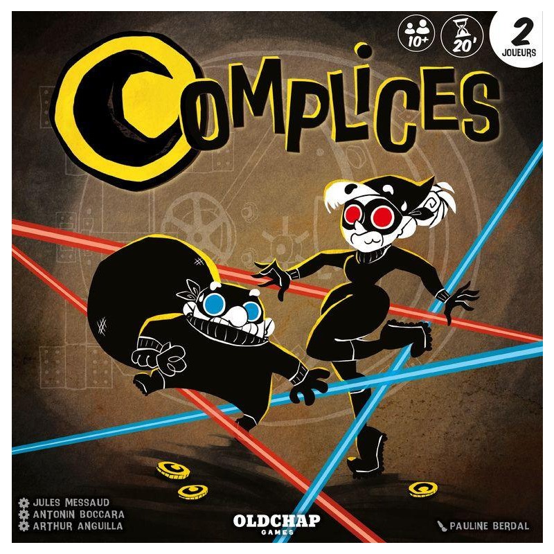Dans ce jeu coopératif, les joueurs ont 2 minutes pour voler le plus de pièces possible sans toucher les lasers de sécurité présents dans la salle. Pour ce faire, chaque joueur enfile des lunettes dotées d’un filtre de couleur lui empêchant de voir un des types de lasers (rouge ou bleu). Le joueur avec les lunettes rouge doit alors tracer avec le feutre un chemin dans la salle afin de récupérer les pièces, tandis que le joueur avec les lunettes bleu est son guide. À eux de communiquer au mieux pour éviter les obstacles ! Chaque pièce récupérée rapporte 1 point, chaque laser touché fait perdre 1 point. La partie est gagnée si les joueurs ont remporté assez de points pour remplir leur planque au bout de 4 manches. Complices est constitué de 16 Salles différentes pour 4 niveaux de difficulté, avec pour chaque niveau de nouvelles formes de lasers et une nouvelle mécanique.