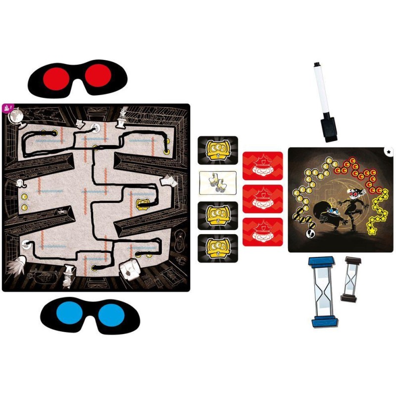 Contenu : 8 feuilles Salle (recto-verso), 2 masques (1 rouge et 1 bleu), 1 feutre, 2 sabliers, 4 cartes Trésor, 3 cartes Police, 1 feuille Planque, 1 dé Casino, 4 cartes Relique, 4 feuilles Astéroïdes, 1 livret de règle