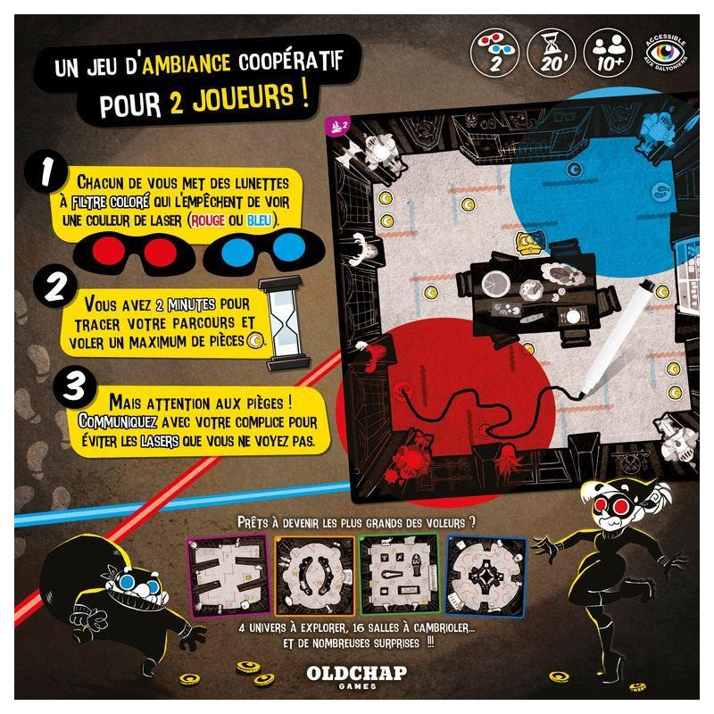 Voleurs en quête de butin, vous devez attraper un maximum de pièces de monnaie sans toucher aux lasers de sécurité. Mais chacun de vous a des lunettes à filtre coloré qui l'empêchent de voir une couleur de laser. Il vous faudra donc communiquer au mieux avec votre complice !