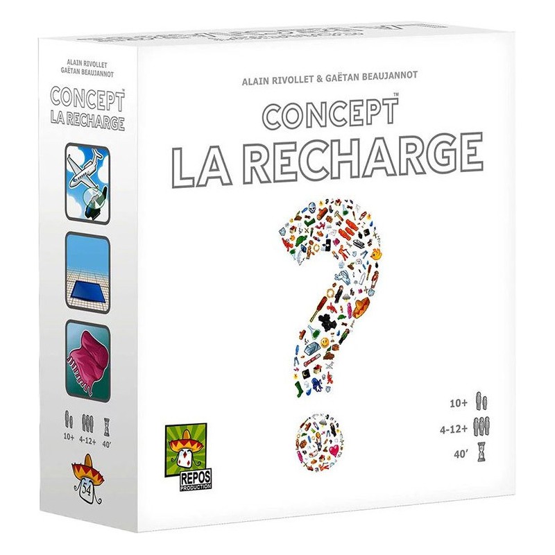Renouvelez les concepts ! Concept n’a plus aucun secret pour vous, vous maîtrisez les icones, l’association d’idées est votre spécialité ? « Rechargez » votre exemplaire de Concept ! Cette petite boîte est une extension forte de 900 nouvelles propositions, de degrés divers et sur tous les thèmes. Elles peuvent être mélangées avec celles du jeu de base ou jouées seules. Contenu