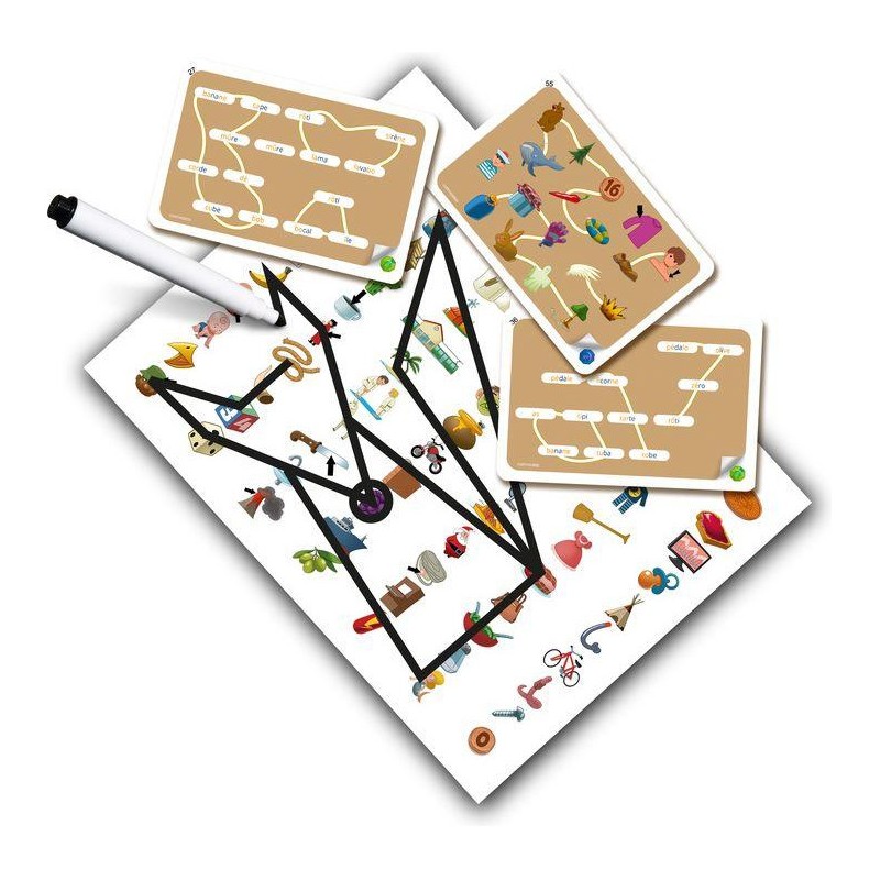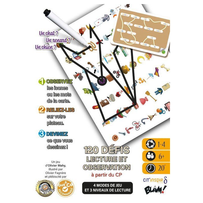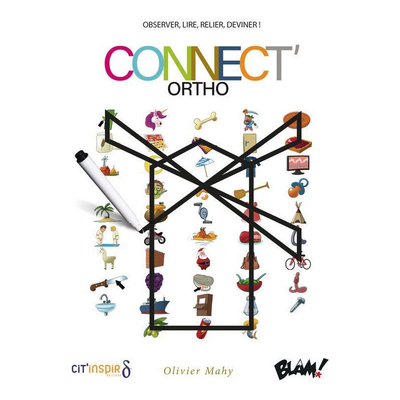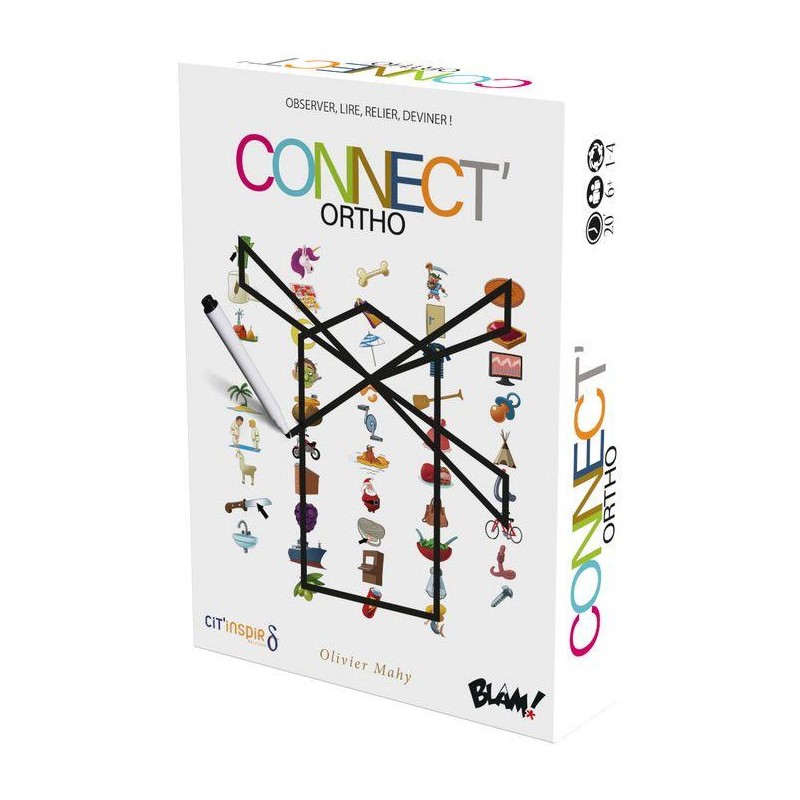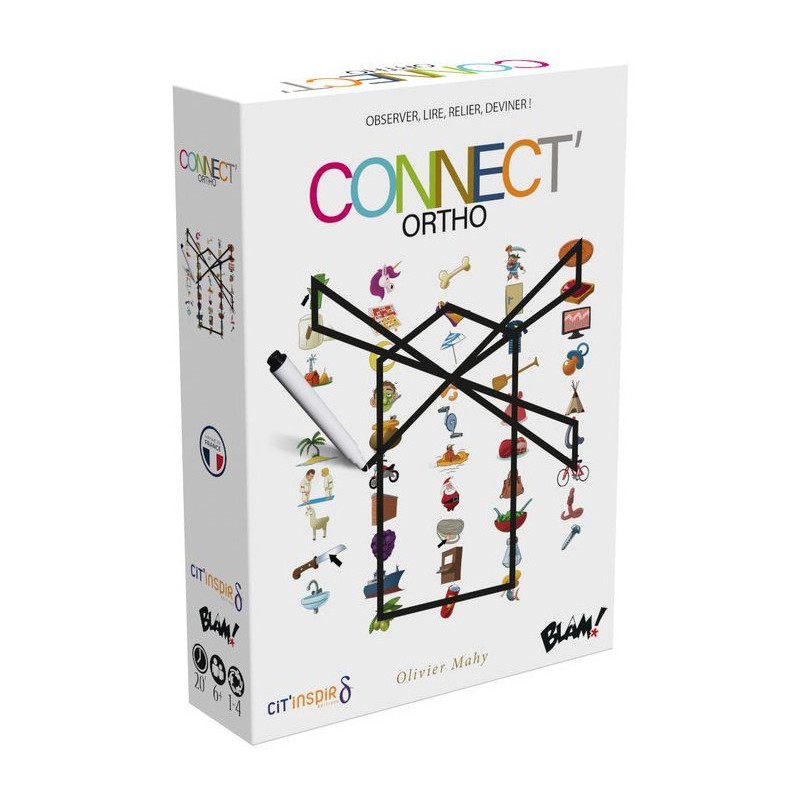 Retrouvez et reliez sur votre plateau les icônes ou les mots de la carte Enigme et soyez le plus rapide à deviner ce que vous dessinez. Grâce à ses 3 plateaux à la difficulté progressive et à ses 120 défis variés, Connect’Ortho encourage l’enfant à lire avec plaisir et l’aide à améliorer sa capacité d’observation de façon amusante !
