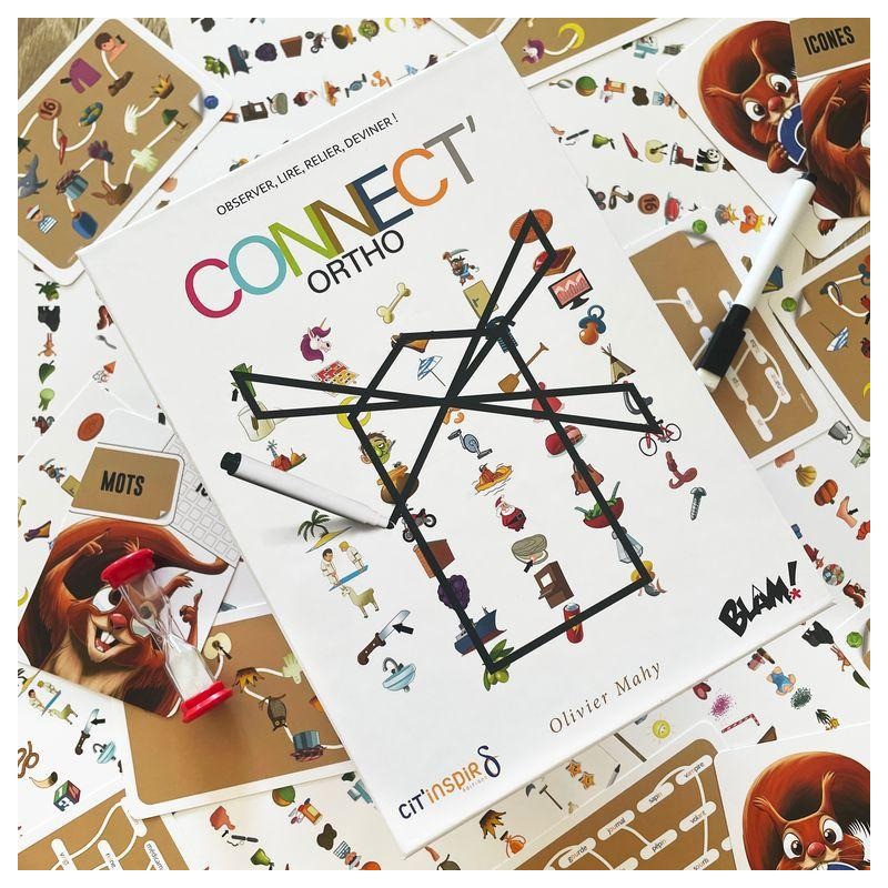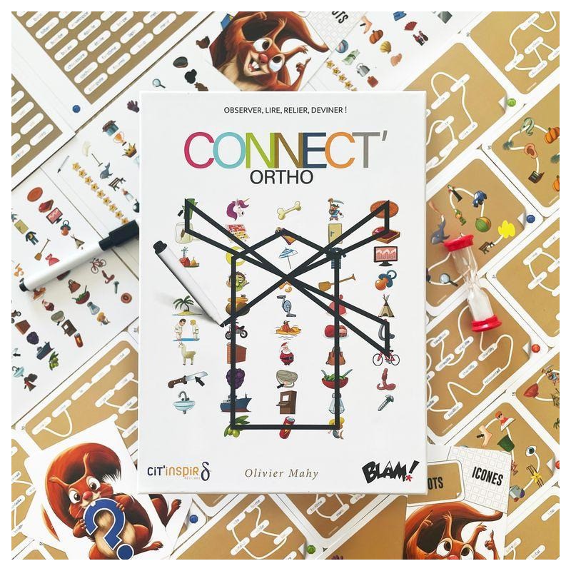 Dans Connect’Ortho, vous devez retrouver et relier sur votre plateau les éléments visibles sur la carte Enigme et être le ou la plus rapide à deviner ce que vous dessinez. Une partie se déroule de la même façon que dans Connecto, sa version d'origine, à l’exception des points suivants : • Il y a 3 plateaux de jeux différents, correspond chacun à un niveau de lecture plus ou moins avancé. • Plateaux et cartes Enigme possèdent désormais une face Icônes et une face Mots : sur les plateaux, les mots correspondent aux icônes au dos; sur les cartes Enigme, les deux faces proposent une énigme différente. • A chaque manche, une carte Ecureuil piochée au hasard dévoile la configuration à suivre pour jouer : c'est à dire quelle face du plateau et quelle face de la carte Enigme utiliser. Grâce à cette nouvelle manière de jouer, l’enfant améliore son niveau de lecture, sa prononciation et sa capacité d'observation au fil des parties. La lecture répétée des différents mots permet de les mémoriser et de les reconnaitre plus facilement par la suite. Connect'Ortho promet donc une expérience pédagogique riche et évolutive, tout en restant un jeu d'ambiance fun et accessible !