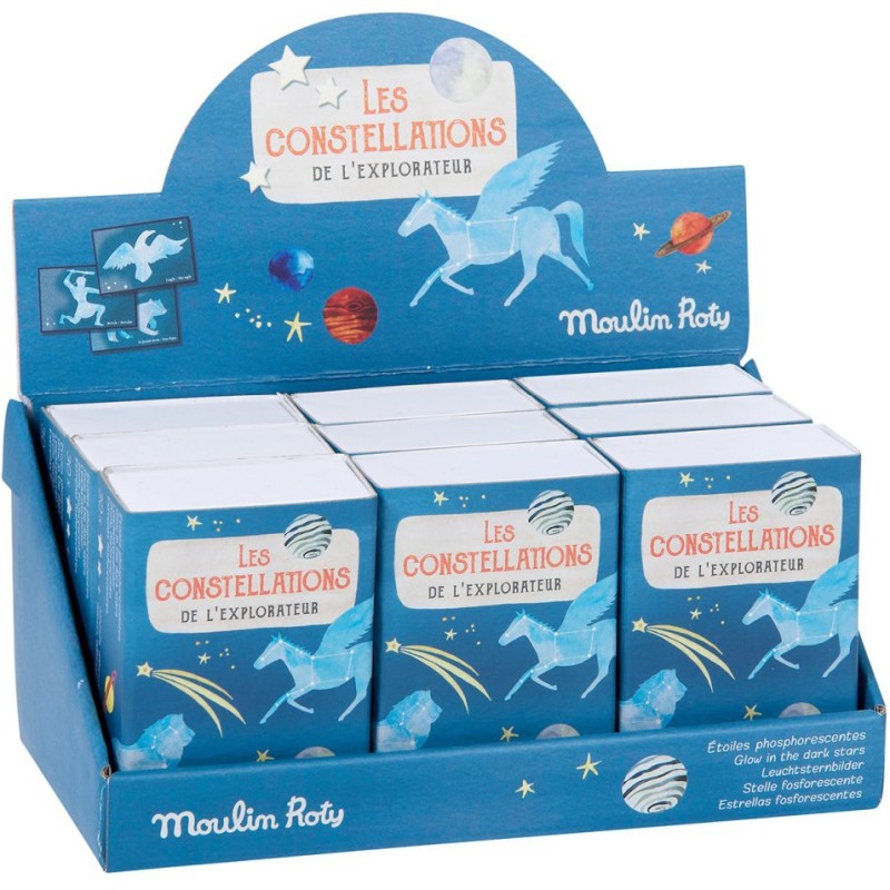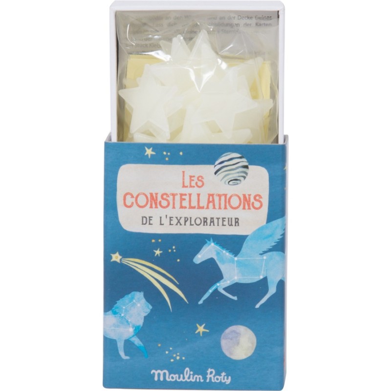 Tout l'univers dans une petite boîte d'allumettes ! Un set d'étoiles phosphorescentes et 10 cartes illustrant les différentes constellations pour composer la petite ours et la grande, Hercule, Pégase ou l'aigle et le dragon…