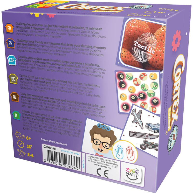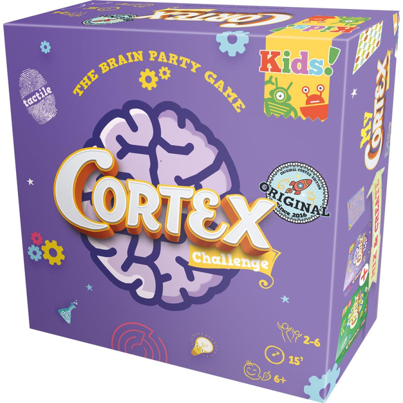 La version Kids du jeu de société cérébral Cortex Challenge pour mettre au défi son cerveau ! Contenu de la boîte : - 90 cartes (74 cartes Épreuves, 6 cartes Challenge tactile, 10 cartes tactiles en relief) - 6 cerveaux-puzzles (24 pièces). Si la version originale met à l'épreuve la mémoire, le sens de l'observation, la coordination et la logique des joueurs à travers une série d'épreuves, il en est de même avec cette version Kids mais avec des épreuves adaptées aux enfants à partir de 6 ans. Ainsi, ce jeu propose aux petits joueurs des défis à leur portée, même en ce qui concerne les défis tactiles, en leur proposant notamment des éléments qui leur sont familiers : fraises, tortue, etc. Rafraîchissant, futé et sacrément alambiqué, Cortex est à la fois un bon jeu de réflexion et de logique et un excellent jeu d'ambiance. Durée d'une partie : environ 15 min. Nombre de joueurs : de 2 à 6.
