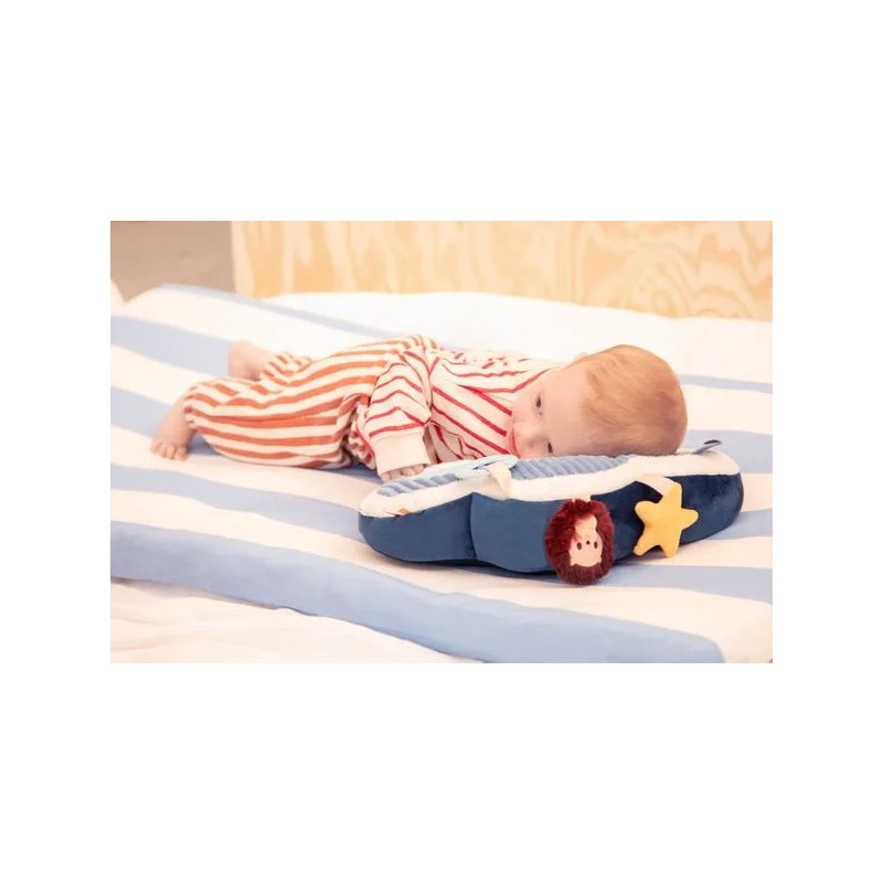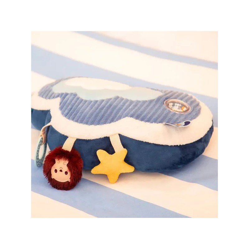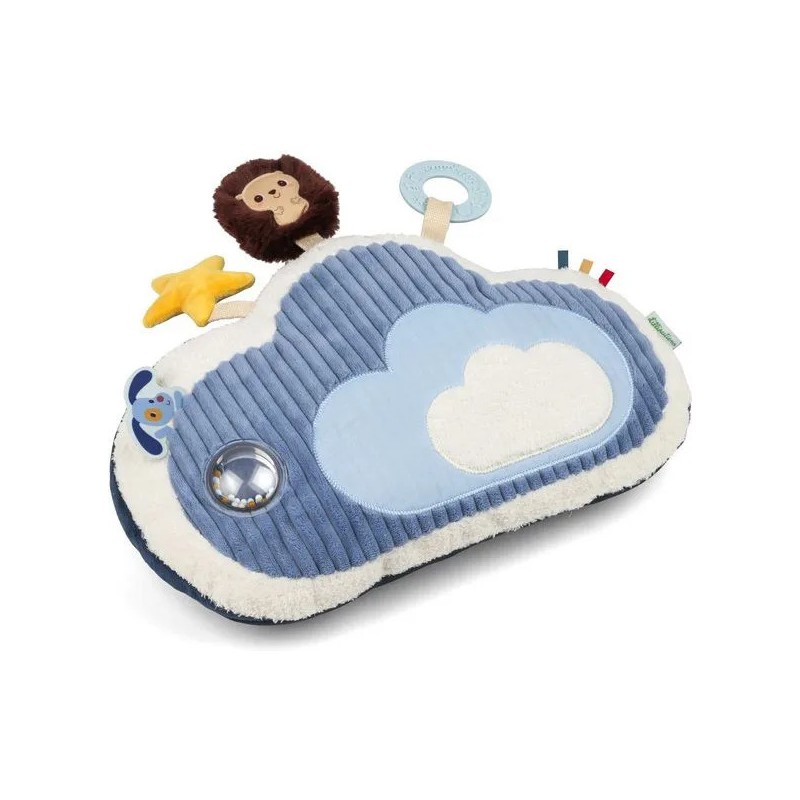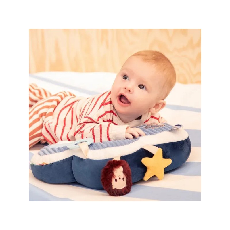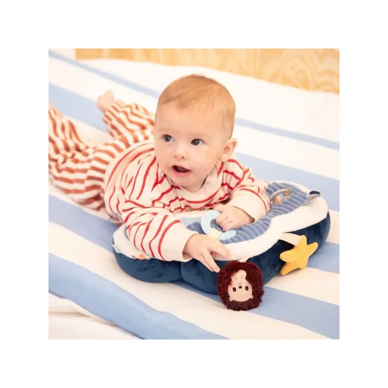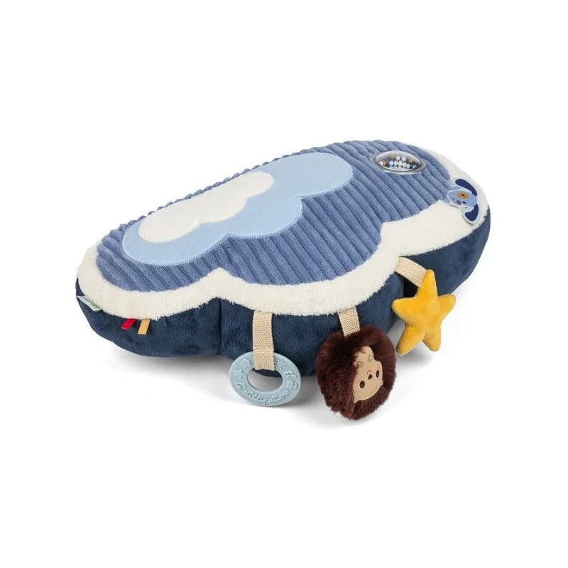 Direction les nuages avec Jules le chien ! Ce tendre coussin d'activités en forme de nuage accompagne bébé dans ses premières découvertes : les textures, les sons, les nuances de couleurs... C'est l'idéal pour développer sa motricité et éveiller tous ses sens. Jules le chien, aviateur hors pair, s’est envolé vers les nuages avec son fidèle compagnon Léon le hérisson. Ensemble, ils invitent bébé à embarquer pour un voyage tout en douceur… direction le ciel et ses merveilles ! Allongé sur le ventre, bébé s'installe confortablement et se lance dans l'exploration de ce coussin à l'aide de ses petites mains curieuses. En manipulant le coussin, bébé rencontre différentes matières qui stimulent son toucher. Dans sa découverte, il s’amuse avec le hochet aux billes colorées, il les regarde bouger et écoute le doux bruit qu’elles font. Jules le chien l'attend non loin de là pour lui faire un coucou ! Ensuite, bébé aperçoit Léon le hérisson, bien accroché au coussin, qui lui propose un hochet tout doux à secouer. Quelle joie de le faire tinter ! Puis, une étoile jaune attire son attention : en la froissant, bébé découvre un bruit de papier qui crépite entre ses doigts. Et pour soulager ses petites gencives, il attrape l’anneau de dentition à portée de main. Sa surface avec relief procure un massage doux qui apaise les tensions liées aux poussées dentaires, tout en offrant une expérience sensorielle agréable. Les étiquettes colorées, elles, invitent ses petits doigts à explorer encore plus. Chaque activité stimule ses sens et renforce sa tonicité musculaire ! Dans ses dimensions 7 x 36 x 23 cm, ce jouet d'éveil assure des moments de jeu remplis de douceur et de découvertes ! Prêts à embarquer avec Jules et Léon ?
