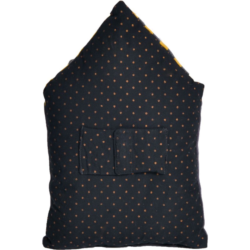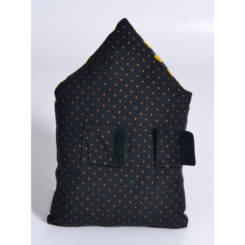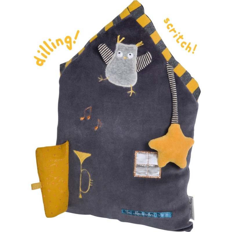Hochet dans une étoile, plastique qui fait du bruit dans les ailes du hibou : tout un tas d'activités pour amuser bébé dans un coussin en forme de maison.