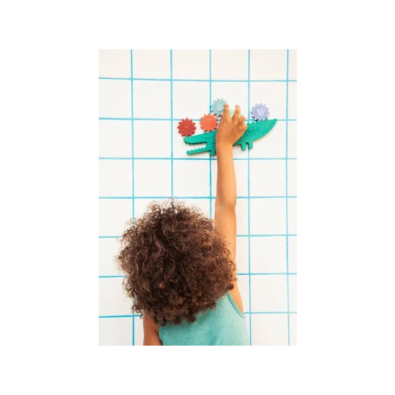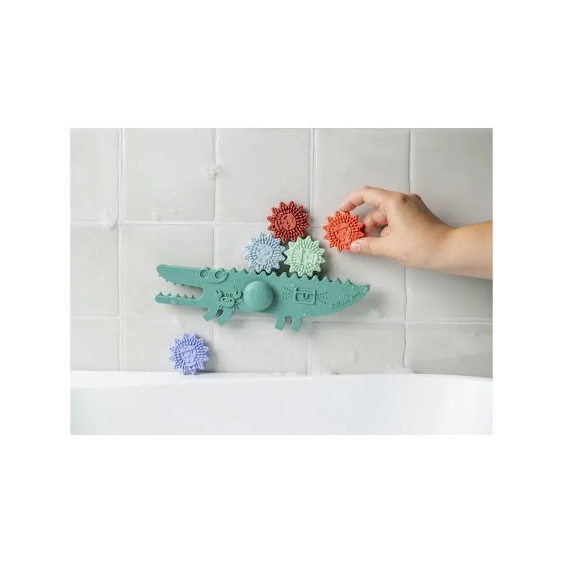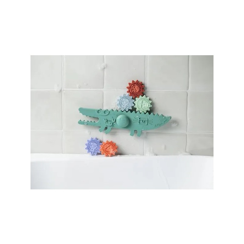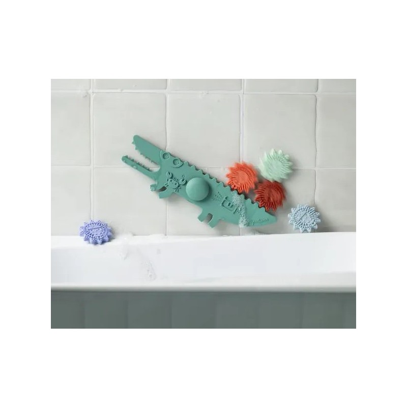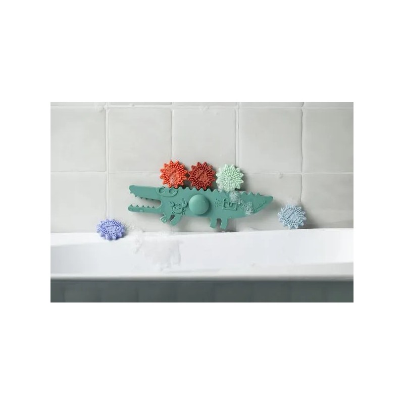 Un panneau de bain en silicone en forme de crocodile qui saccroche à la paroi grâce à une ventouse. Les cinq hérissons-pirates tentent dapprocher discrètement le coffre au trésor mais gare au gardien du bain ! Il faut réussir à les poser en équilibre sur son dos sans quil ne bascule et les précipite à leau.