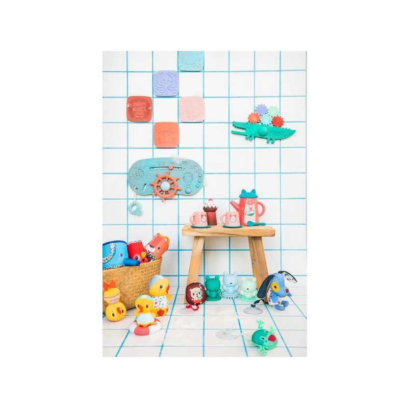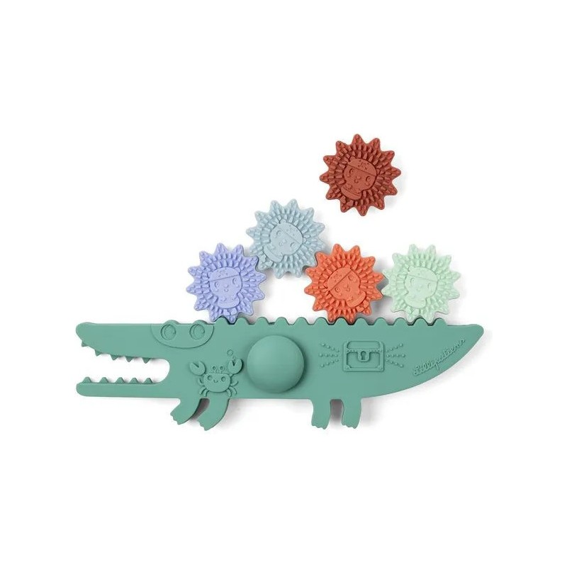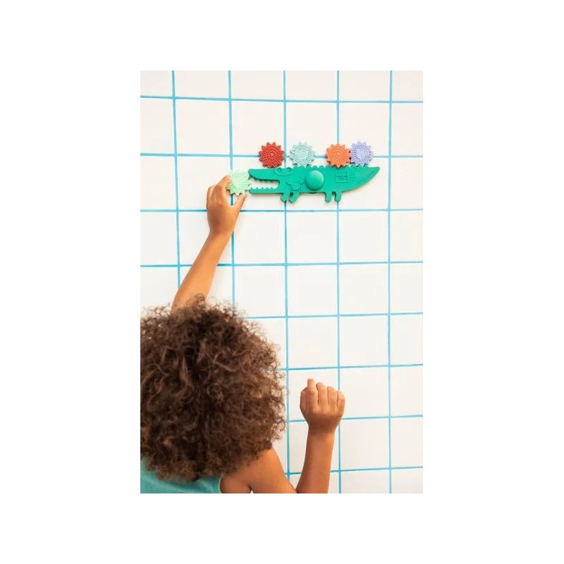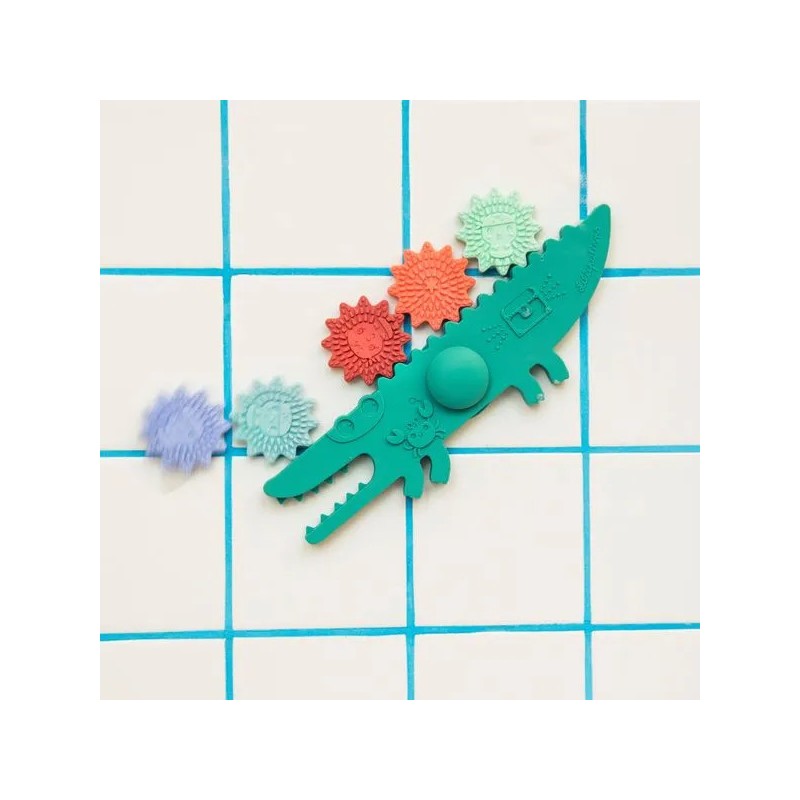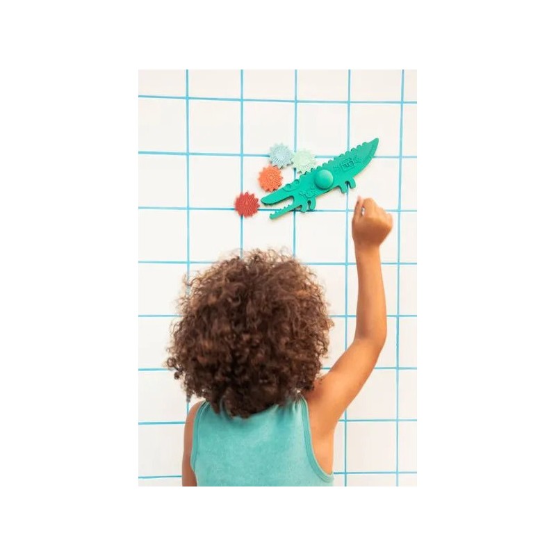 Un panneau de bain en silicone en forme de crocodile qui saccroche à la paroi grâce à une ventouse. Les cinq hérissons-pirates tentent dapprocher discrètement le coffre au trésor mais gare au gardien du bain ! Il faut réussir à les poser en équilibre sur son dos sans quil ne bascule et les précipite à leau.