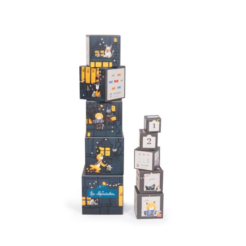 Pour développer la capacité de l'enfant à manipuler et à compter : jeu de 10 cubes en carton à empiler ou encastrer, du plus grand au plus petit, avec 5 thèmes illustrés représentant des portraits, accessoires, et tout l'univers musical des Moustaches !